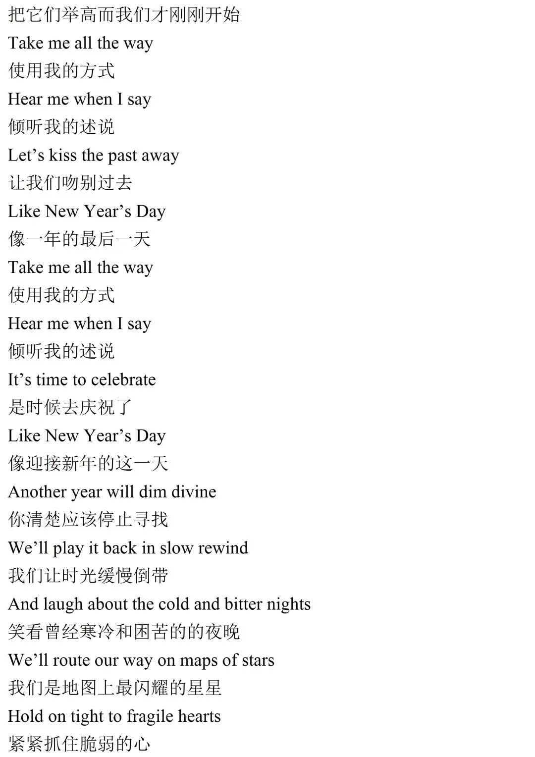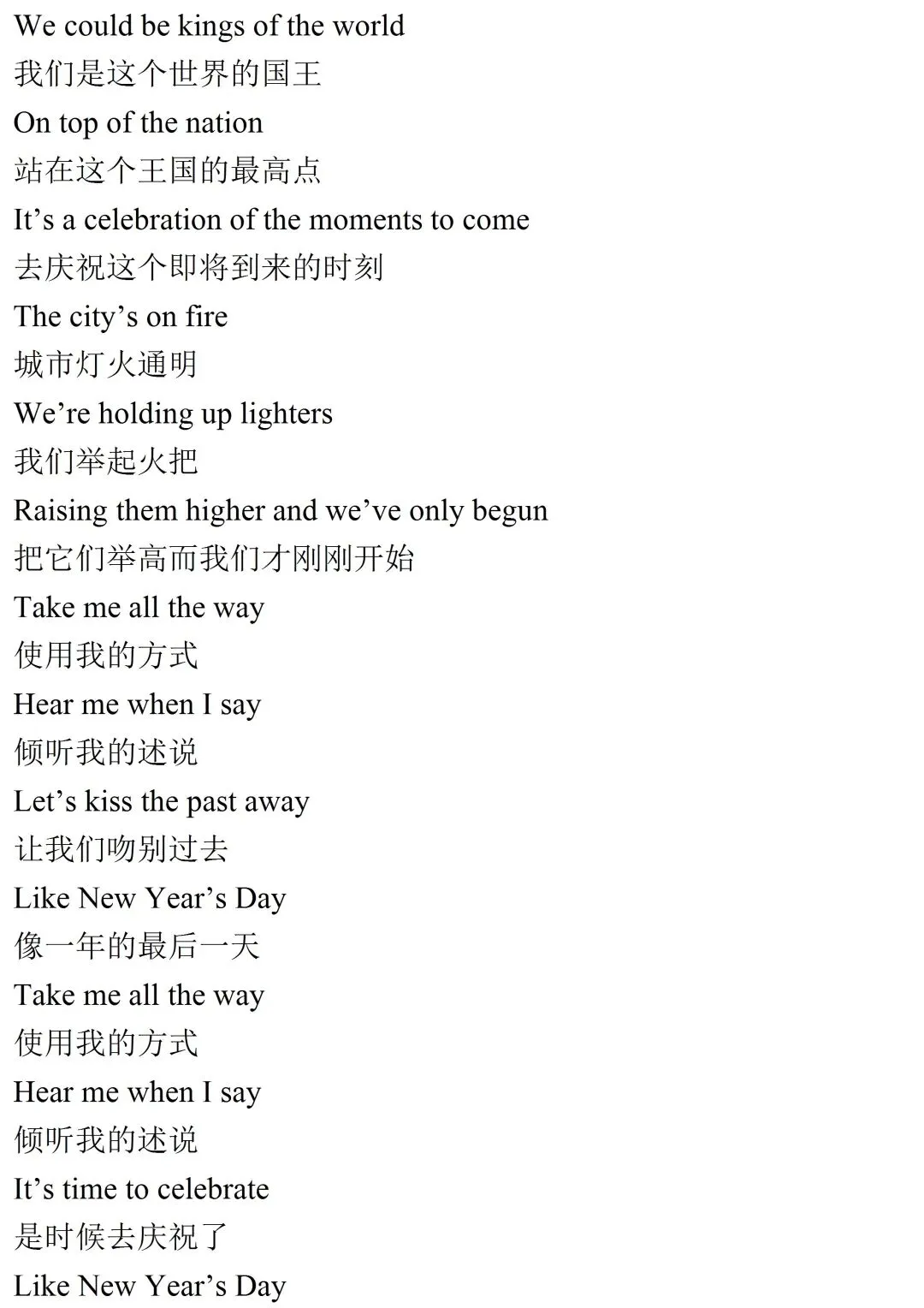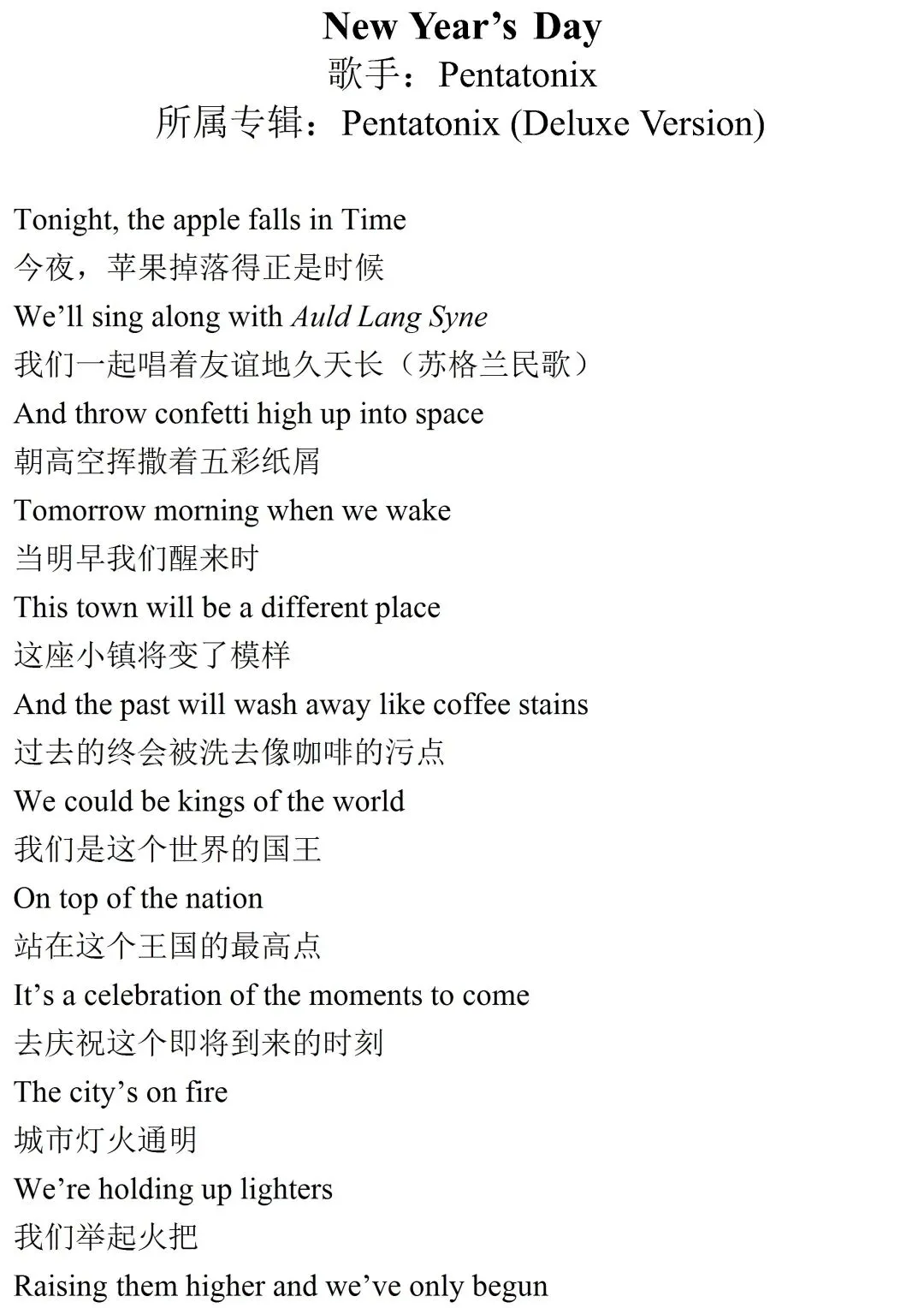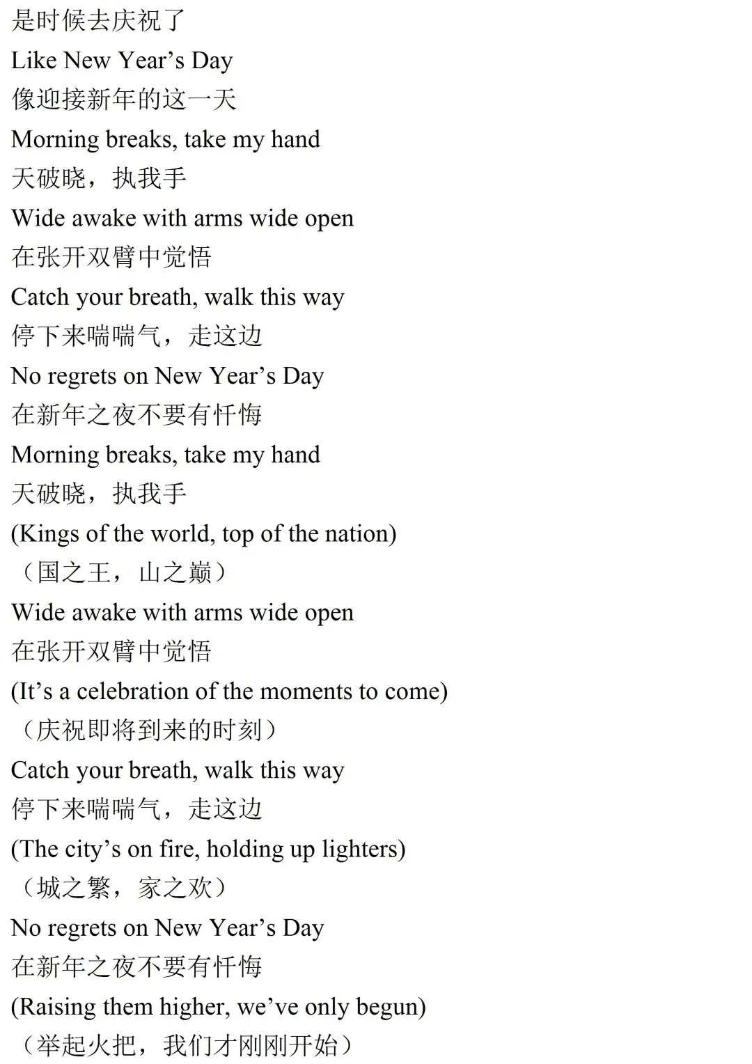 这首歌曲满含新年氛围,以欢腾节奏告别过往苦涩,邀约挚友相伴,在灯火与期盼中庆祝新生,满是热血与希望。