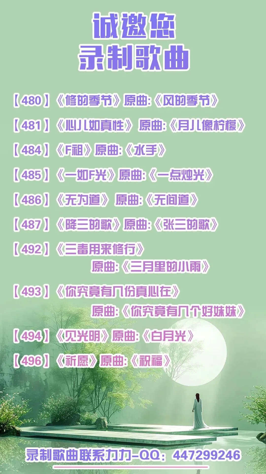 家人们好, 以下歌曲还没有录制,现诚邀家人们参与录制。如果您也喜欢唱歌,并且愿意录制老师的歌曲,录制完成或者有意录制都可以联系提子、力力老师或者锡箔老师,如有意愿也可以留言,我们将会与您取得联系,感谢您的参与。