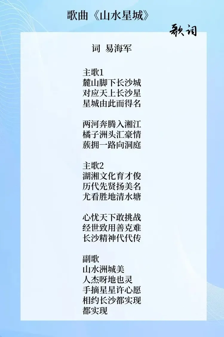 易海军作词的《山水星城》,犹如一幅展开的湖湘文化诗意画卷,将长沙这座城市的历史、文化、精神与自然风光巧妙地融合在一起,每一个字都仿佛是一颗灵动的音符,共同奏响了一曲赞美长沙的赞歌。