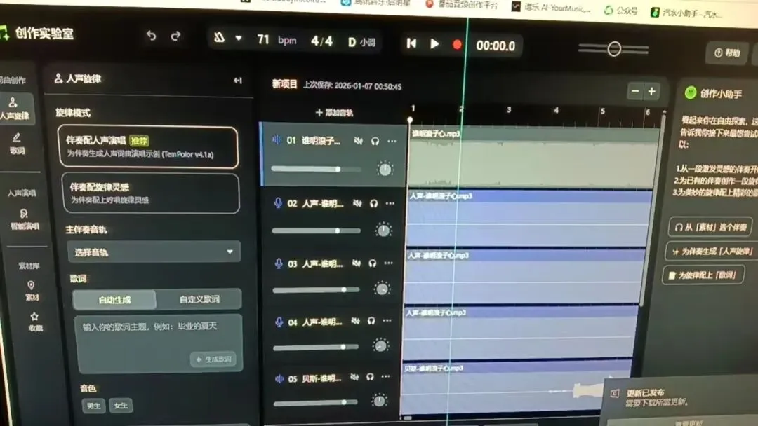 1、编辑器主要分为三个部分,词曲创作、人声演唱和素材库。 第一个是词曲创作,里面有一个生成人声旋律的功能,你只需要把伴奏或本地音频拖到轨到,输入自定义歌词,或者使用自动生成的歌词,就能为伴奏生成带人声的旋律。