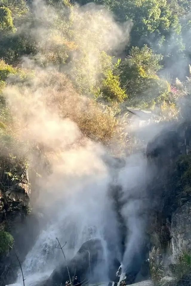 登热海置身于沸腾的云雾缭绕的灵泉中,尝尝温泉的味道。