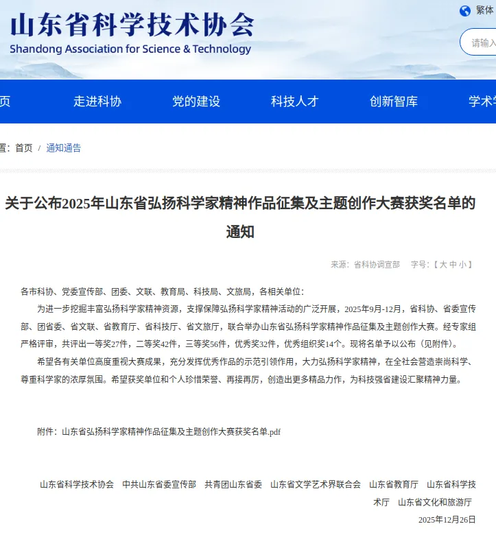 本次山东省弘扬科学家精神作品征集及主题创作大赛旨在充分发挥优秀作品的示范引领作用,大力弘扬科学家精神,在全社会营造崇尚科学、尊重科学家的浓厚氛围。未来,本院将以大赛为契机,持续挖掘丰富弘扬科学家精神资源,积极创作相关文化艺术作品,为科技强省建设汇聚精神力量。