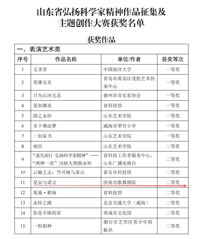 日前,由山东省科学技术协会、中共山东省委宣传部、共青团山东省委、山东省文学艺术界联合会、山东省教育厅、山东省科学技术厅、山东省文化和旅游厅联合举办的山东省弘扬科学家精神作品征集及主题创作大赛已圆满结束,经省科协官网公示,济南市歌舞剧院原创歌曲《星辰与诺言》荣获表演艺术类二等奖。