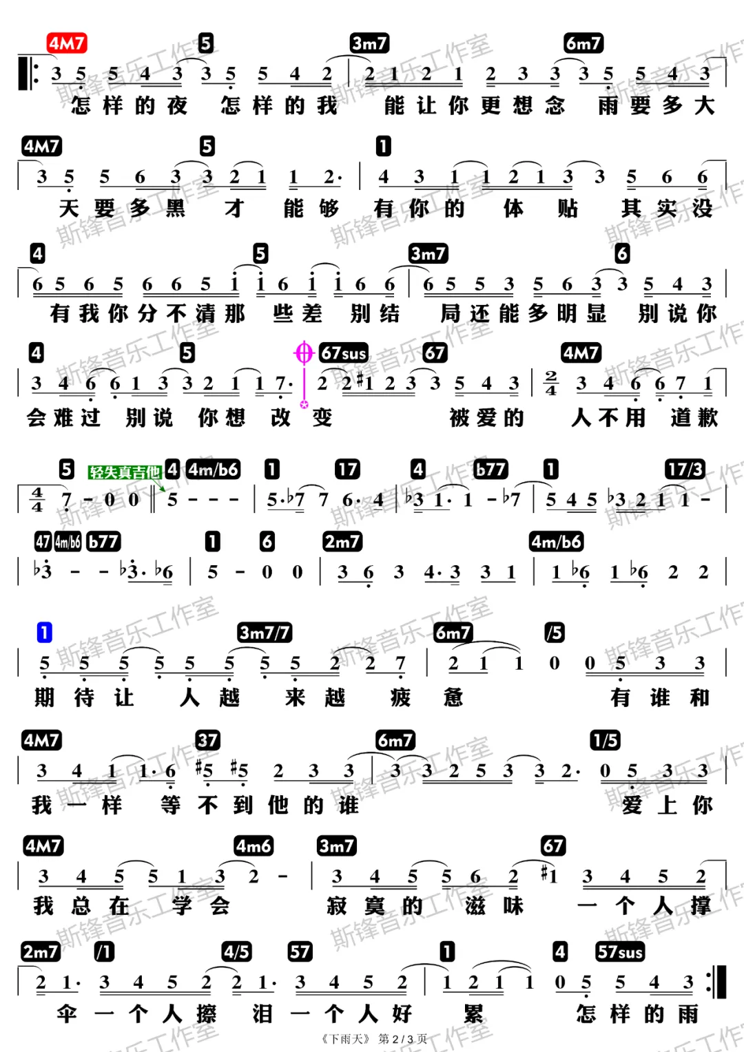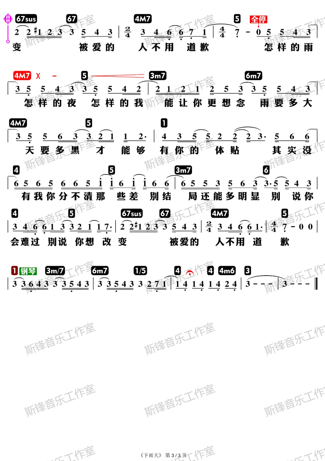 本次分享的《下雨天》简谱采用标准简谱记谱法,完整呈现了主歌、副歌及间奏部分的旋律线条。谱面标注清晰,包含准确的音符时值、调号,特别适合初学者学习使用。