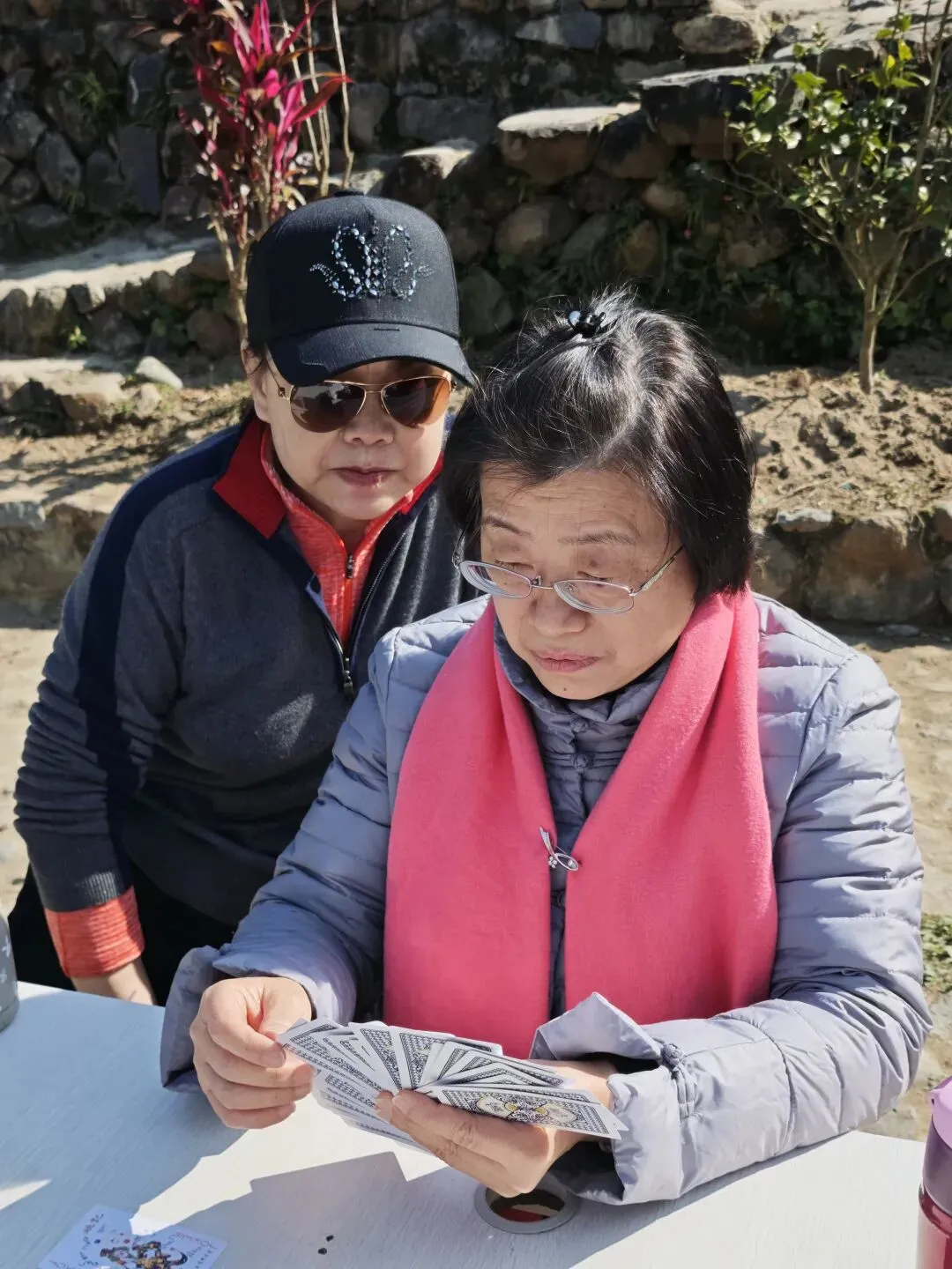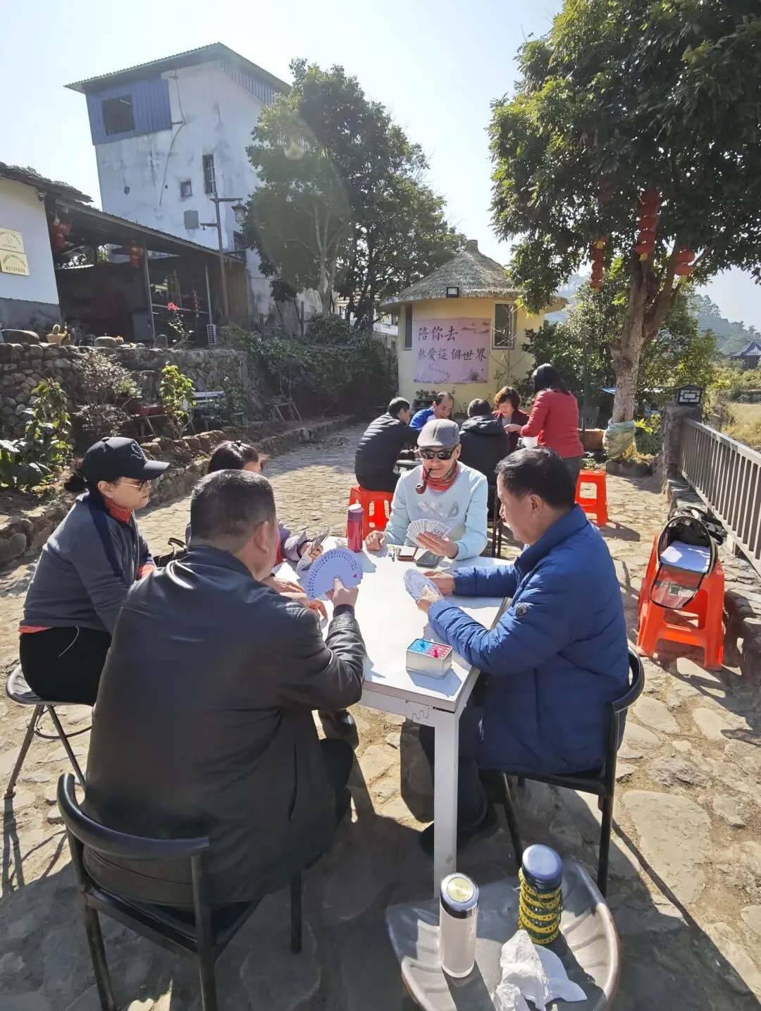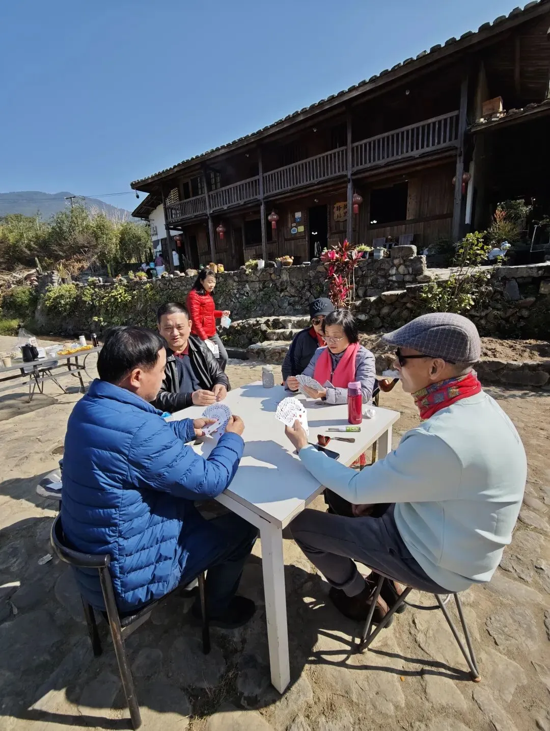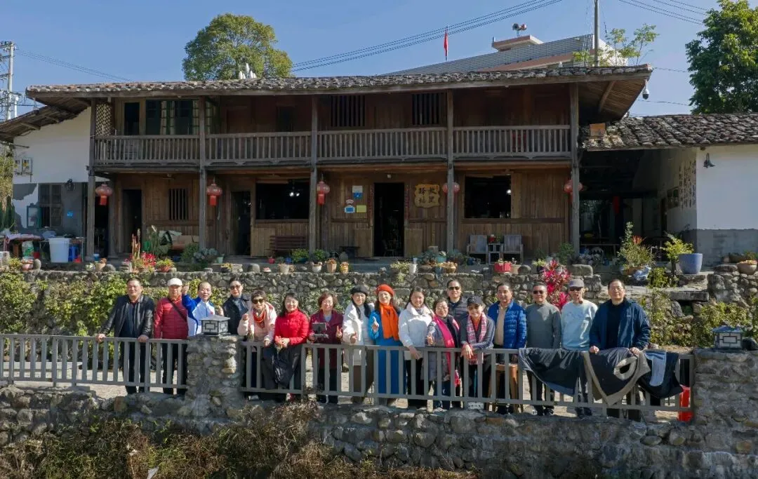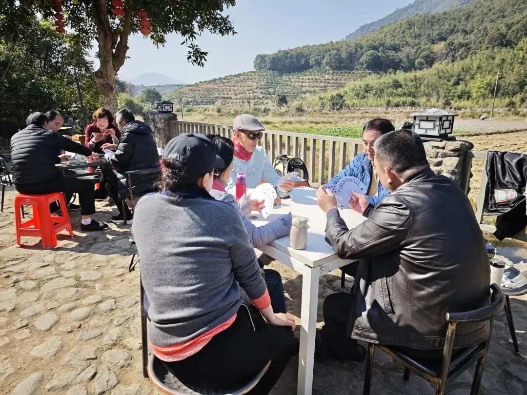 冬日的福州白沙井下村,阳光和煦得恰到好处。在黄兆丹同学的精心引荐下,我们福州三中81、82届的部分老友,在这片田园山野里重逢了。青石垒砌的院落、古朴的木质小楼,成了这场聚会的天然背景。老友中不乏“老法师”,大家纷纷举起相机、手机,将光影穿透枝叶的斑驳、石墙木楼的韵味一一定格。漫步村道,大家聊起三中的求学时光,那些青涩的往事仿佛就在昨日。难得露面的王小梅同学笑语盈盈,亲切和老同学打着招呼;有的同学插科打诨,惹得笑声传遍了田野。散步途中,我们偶遇了正在阳光下锻炼的智障儿童。那一刻,大家不约而同地放慢了脚步。看着孩子们努力的样子,我们不仅感受到了冬日的物理温暖,更触碰到了社会对弱势群体那份沉甸甸的关爱。这份人间温情,让我们的聚会多了一层生命的厚度。散步归来,院落里瞬间沸腾——三桌掼蛋同时对垒,这大概是当下最讲究的“智力体操”了。青石桌旁,两位“牌坛高手”成了焦点:“掼蛋大师”王小梅: 眼神专注,整理牌路有条不紊,那份从容范儿,真有几分运筹帷幄的定力。“专业教练”陈光辉: 一边从容出牌,一边化身导师,给身边的“入门徒弟”复盘教学,俨然一副专业教练的派头。江湖传闻,这两位大师强强联手,本想横扫全场,没曾想竟遭遇了“滑铁卢”,惨败给了一众“徒弟”!这一出“青出于蓝”的戏码,成了全场最大的焦点。一旁的波哥叼着烟斗,在烟雾缭绕间稳稳打出关键牌,清脆的甩牌声混着大家的起哄声,在晴空下回荡。牌技有高低,兴致无贵贱,这份互相打趣的真诚,才是同窗情最鲜活的模样。在井下村古朴的灶台边,我们找回了刻在福州人骨子里的味觉记忆:锅边糊: 现磨米浆绕锅一周,汤头鲜醇,这一口入喉,便是童年。油饼: 金黄酥脆,裹着柴火的焦香,咬下去咔嚓作响。农家菜: 刚从田头摘下的青翠,清甜爽口,洗净了都市的浮躁。王小梅和陈光辉也从牌桌上的“肃穆”切换到了“食客”模式,大家捧着碗、倚着木柱,在老房子的梁柱下笑着合影。乡土美味里,藏着化不开的乡愁,更藏着续不完的情谊