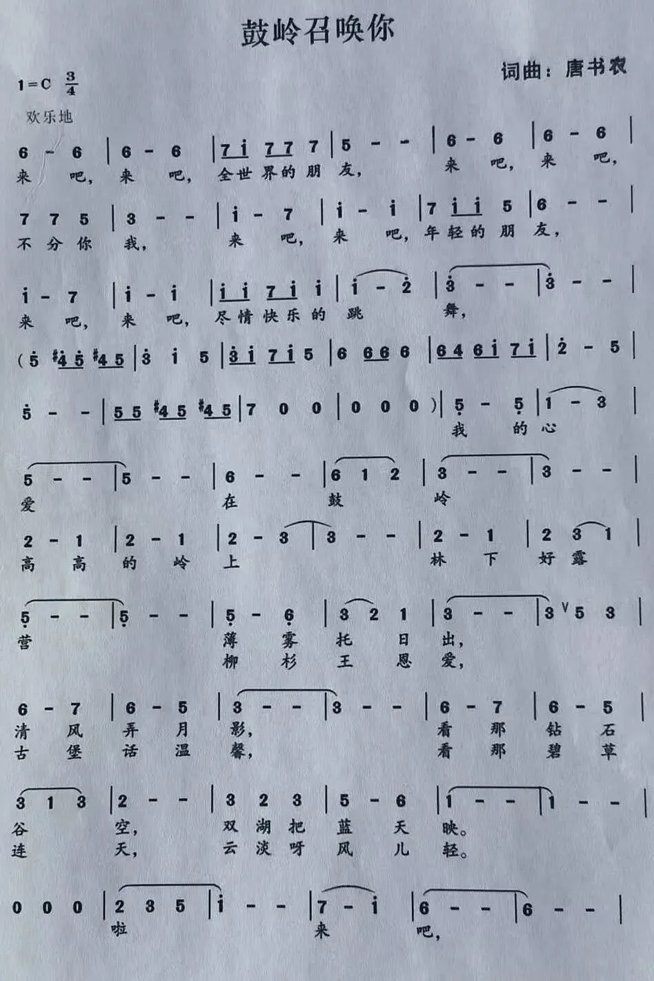 十多年来,唐书农的夏天都是在鼓岭上度过的,鼓岭就仿佛他的第二故乡。长期居住在鼓岭,便心生了一种“他乡即故乡”的情愫。对于鼓岭的山水、人文,唐书农都比较熟悉。鼓岭宜夏村与鼓山之间,有一条山路,那是一条很安静的小路。就是在这条小路上,唐书农开始了歌曲创作之路。先后创作出《鼓岭之歌》、《鼓岭的邀请》、《鼓岭召唤你》三首歌。2019年12月26日在中央人民广播电台经典音乐栏目播出《鼓岭之歌》;2025年9月25日,央视风云音乐频道播出歌曲《鼓岭召唤你》;2026年1月8日,《鼓岭召唤你》获得2025福建省首届村歌大赛组委会特别奖。