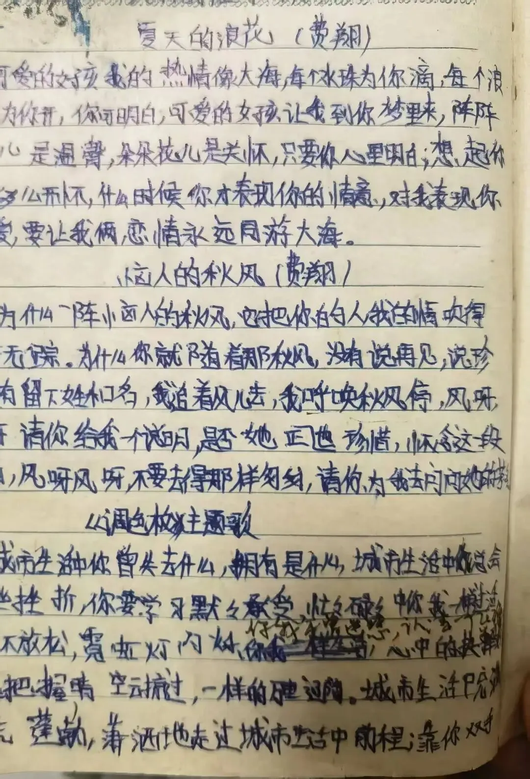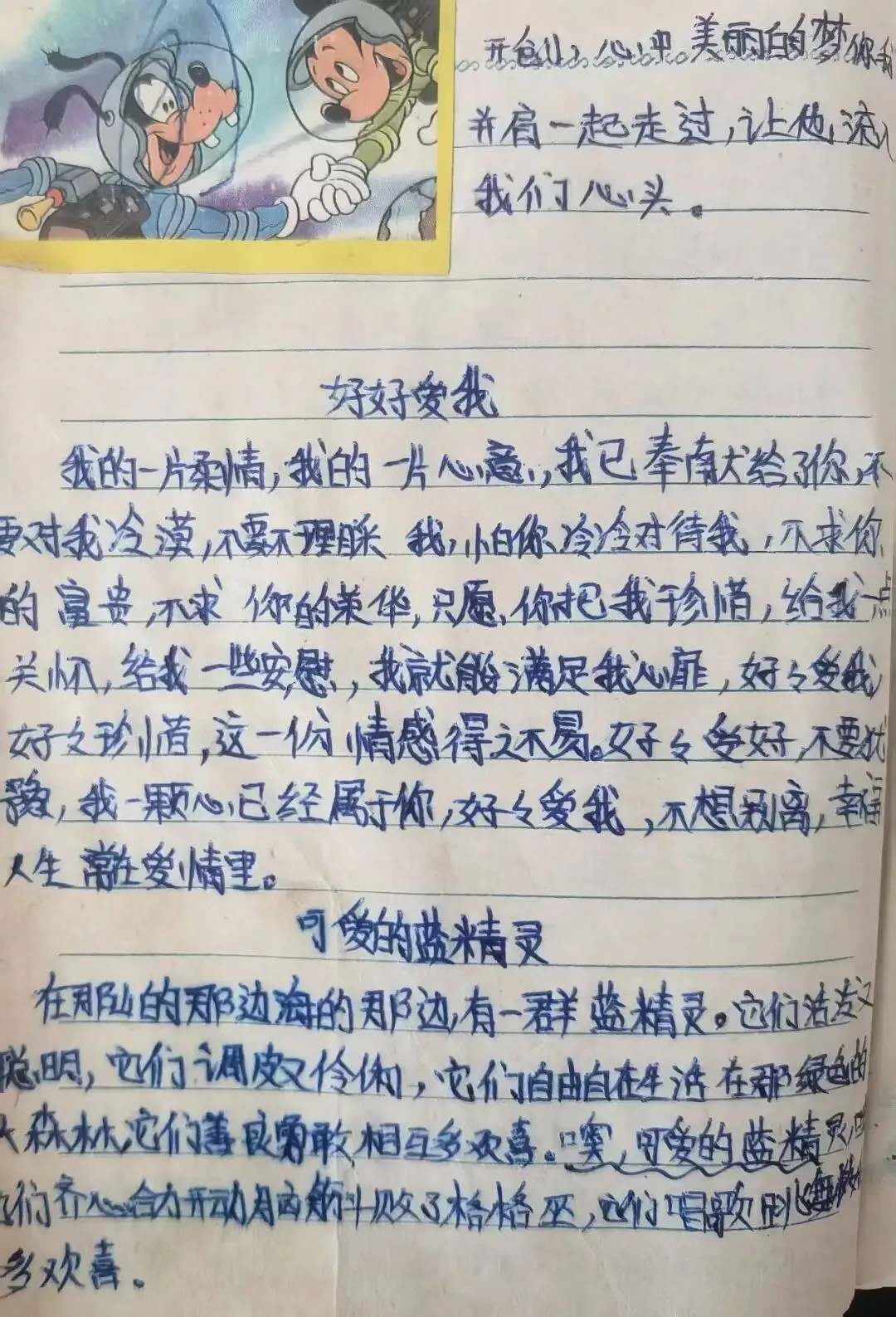 我小时候听到的版本还是费翔翻唱的,翻唱时间大概是1986年左右,传到大陆也就差不多是1988年左右,歌词本记录这些歌的时间差不多都是这个年份的,上小学四五年级的样子。歌词都是电视播放的时候一句一句记下来的歌词,不记得有没有字幕了,好像是没有,全凭小伙伴们你一句我一句的纠正对错。费翔的版本是VIP的,不知道为啥这首名不见经传的歌曲要VIP,感觉还不如《恼人的秋风》有名气呢。原唱是凤飞飞,1981年发行。如果穿越回去大几岁的年纪,凤飞飞也应该是我喜欢的歌手,纯天然的样貌,洁白整齐未经处理的牙齿,在现在的娱乐圈简直太稀缺了。费翔和凤飞飞相比,我还是喜欢费翔版本的,可能还是先入为主,或是因为我喜欢宽广低沉的音域。张蔷翻唱的版本有点嗲,故意装温柔小巧可爱的语调,也就是现在说的“扮嫩”,喜欢不来。我也放上来,大家比较一下。 上世纪八十年代初思想意识还是比较纯粹的年代,物欲拜金的思想还未盛行,不求你的富贵不求你的荣华,就是正向的价值观。在那山的那边海的那边有一群蓝精灵,他们活泼又聪明,他们调皮又伶俐,他们自由自在生活在那绿色的大森林,他们善良勇敢相互都关心。哦~可爱的蓝精灵,哦~可爱的蓝精灵。他们齐心合力开动脑筋,斗败了格格巫,他们唱歌跳舞快乐多欢心。