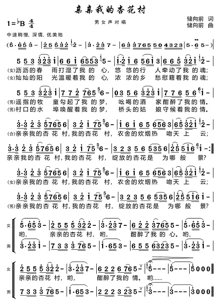 歌曲采用“两段主歌 + 副歌重复 + 尾声呼应”的结构,既强化了主题,又形成了回环往复的韵律感,如同游子对故乡的思念,萦绕心头、挥之不去;反复吟唱的“亲亲我的杏花村”,饱含亲昵与珍视,如同对亲人的呼唤,直白质朴极具穿透力。歌曲曲风以轻柔舒缓的民乐为基底,用清脆的笛音和弦乐铺陈,温润入耳,将听众带入烟雨朦胧的意境中。主歌旋律线条平稳绵长;节奏与歌词的韵律精准匹配;副歌旋律悠扬开阔,音域适度提升;“哦”字的长吟浅唱,对杏花村的眷恋之情充分释放,形成情感高潮;尾声节奏渐缓,旋律更轻柔,让“酣醉我的心”的沉浸感持续蔓延。