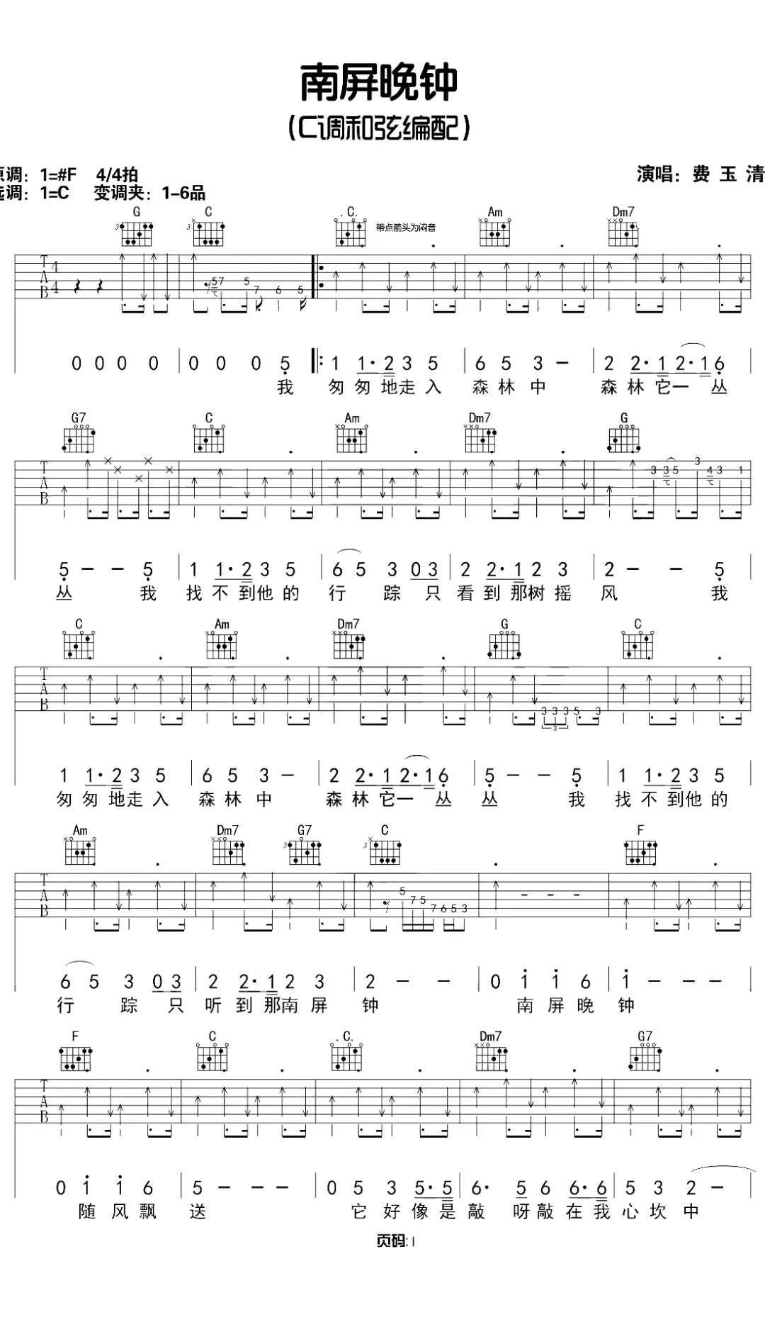 这份谱子最贴心的是 **“C 调和弦编配 + 变调夹提示”**:原曲是 #F 调,谱子直接适配 C 调常用和弦(C、G、Am、Dm7 等),新手也能快速上手;若想贴近费玉清的原唱调性,只需把变调夹夹在 1-6 品,轻松适配不同音域。谱面标注清晰,不仅有和弦指法图,还把扫弦节奏、分解节奏的 “强弱拍” 用符号标出 —— 比如开头 G 和弦的 “↓↓↑↑↓↓↑”,搭配歌词 “我匆匆地走入森林中” 的节奏,一弹就能抓住歌曲的轻缓氛围感。