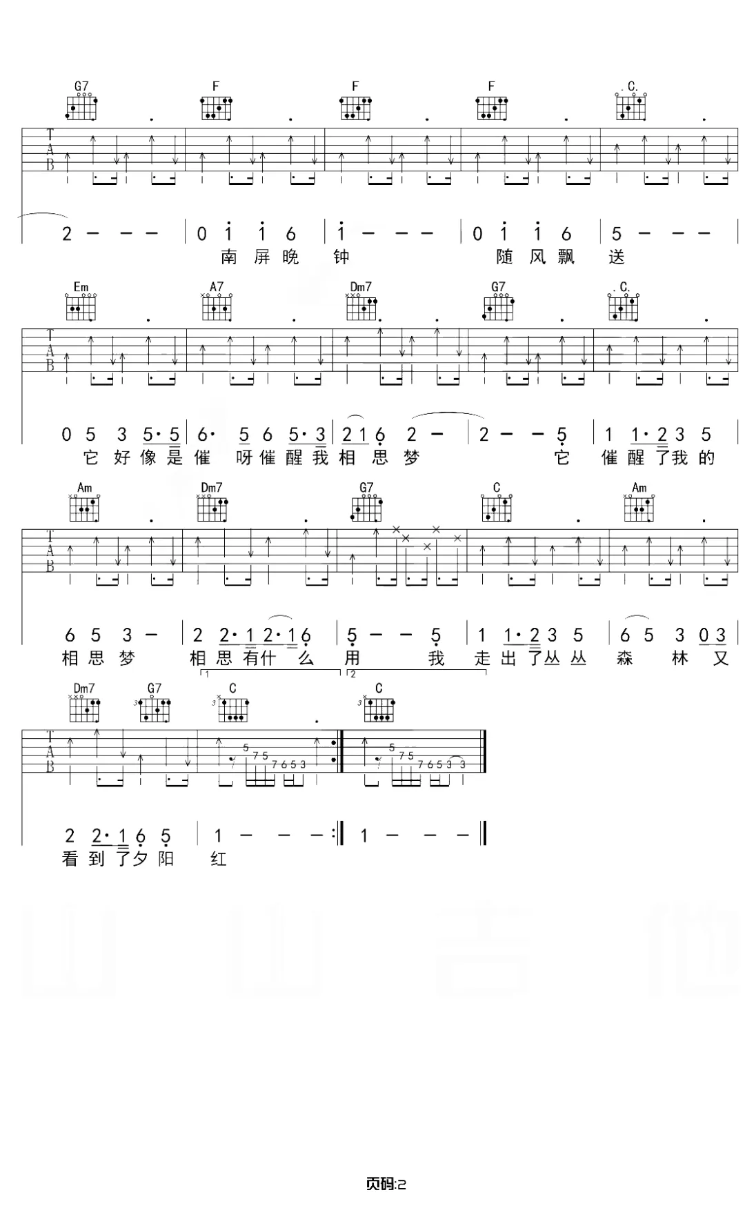 为什么推荐这份谱?它不是简单的和弦堆砌,而是把《南屏晚钟》的 “意境” 拆进了指法里:比如 G7 和弦的 “×××” 闷音,像森林里模糊的脚步声;C 和弦的附点节奏,对应歌词里 “匆匆” 的语气 —— 弹的时候,仿佛真的跟着旋律走进了那个摇着树影的黄昏森林。