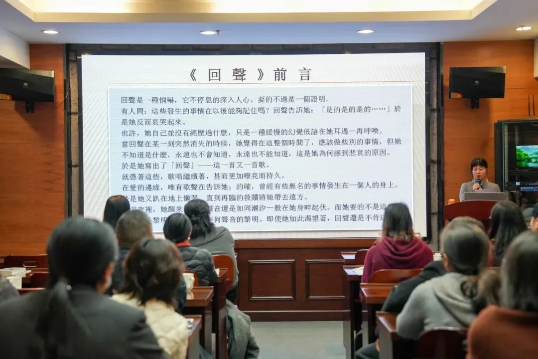 在讲座的“赏听”环节。李老师与大家一同欣赏了专辑《回声》中的全部十一首作品。每首歌曲开始前,李老师都会结合创作背景,解读歌词中蕴含的故事、歌曲调性与三毛彼时的心境,引领听众们深入理解。此外,现场还特别设置了互动环节,邀请听众朗读三毛的文字片段。当歌声、乐音与诵读声交织在一起,整个现场沉浸于一种深切而动人的氛围之中,大家仿佛跨越时空,走进了三毛的情感世界。