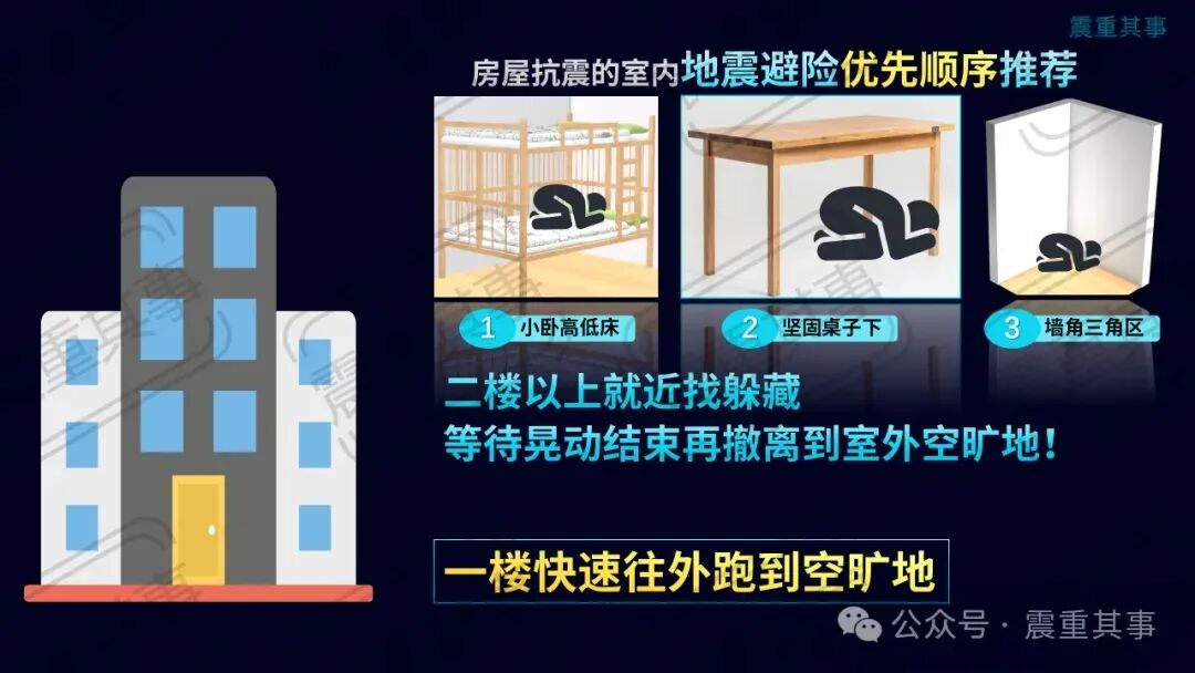 二楼以上:就近躲:高层撤离时间不足,盲目跑易被坠物砸伤,因此优先选择安全区域躲避。