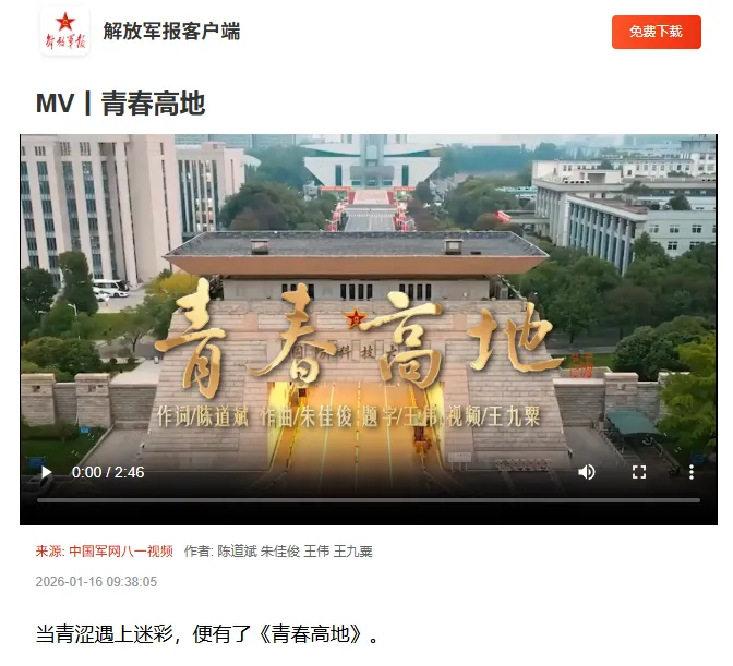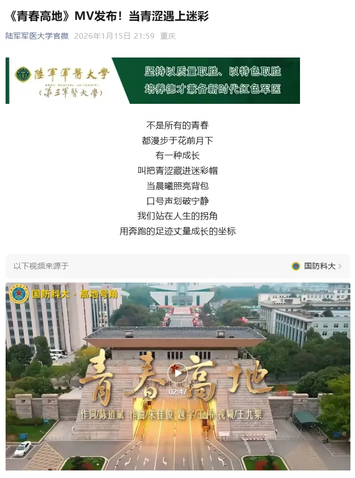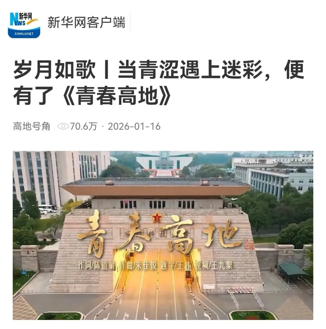 近日,国防科技大学原创歌曲《青春高地》持续刷屏网络,新华网、学习强国、解放军报、中国青年报、中国军网、中国军号等多家权威媒体纷纷转发点赞。今天,就让我们一起跟随《青春高地》相关报道,聆听那正步铿锵里的滚烫心跳……