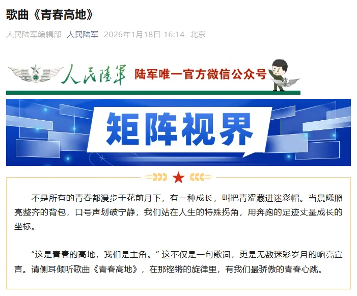 《青春高地》以流畅的旋律和真诚的歌词传递着青春的温度与力量。“把青涩藏进了迷彩帽”的旋律响起时,触动许多听众内心的柔软;“这是青春的高地,我们是主角”的歌声回荡间,不少人从中感受到共鸣与力量。