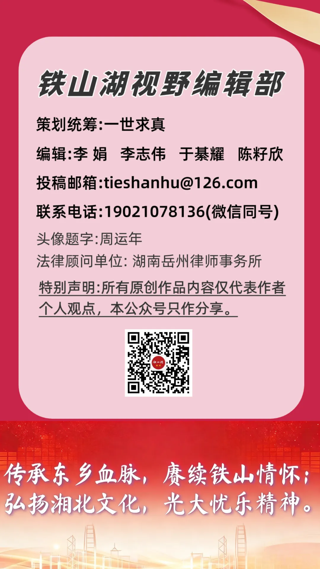 一首歌,是一份礼赞,更是一份期许。愿《铁山湖视野》坚守初心,以文字为舟,以文化为帆,载着铁山人的乡愁与信仰,在岁月长河里行稳致远。
