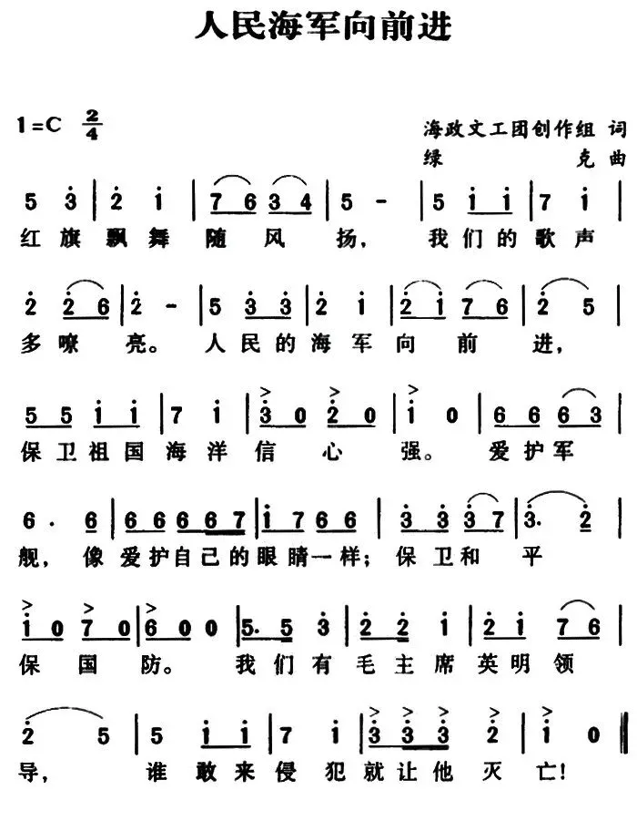 因“海军在前进”演奏效果极佳,文工团领导决定由创作组集体填词,董雨霖老师根据歌词对音乐做了适量修改后,定稿为歌名《人民海军向前进》,作词为海政文工团创作组,作曲为绿克。此歌曲第一次发表在1951年11月1日军委总政治部文化部编印的《部队歌曲选集》第二集上,并由海政文工团当日首演,董雨霖老师也调到创作组工作。