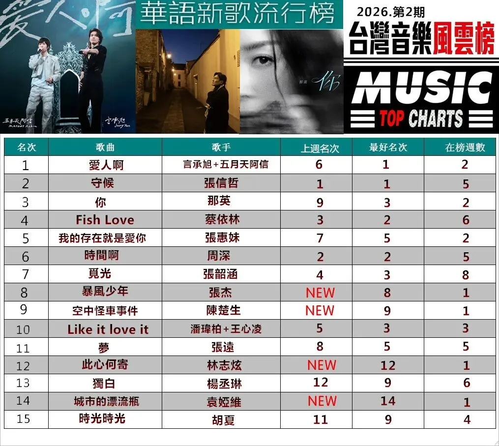 本周言承旭和五月天阿信浪漫合唱曲《爱人啊》升至冠军。《爱人啊》由五月天阿信、台湾的阿火及马来西亚的佳旺、林乐伟联合词曲创作。佳旺表示:“我觉得我现在好像慢慢完成着小时候觉得不可能的梦想。”说到这次创作《爱人啊》的始末,佳旺表示,这首歌曲由他在2024年10月31日在台北和林乐伟,阿火写好后,11月3日录成Demo,辗转被相信音乐相中并确定要选用。"然后由阿信调整词曲之后最后与言承旭一起演绎。当恒星划过伤口,我们一同穿过黑夜。让任性的灵魂都能被滚烫的泪收服。爱人啊!我们的爱没有区别,我们都在等对的那个人!言承旭 X 五月天阿信 〈爱人啊〉浪漫诠释期盼爱的憧憬,继续迎接2026更多的惊喜重逢!本周情歌王子新歌《守候》退居亚军。曲未终 情未了,《守候》如韩剧OST主角相互依偎的醇享浪漫,展现阿哲深情吟唱的温暖冬季的恋歌。〈守候〉日前MV首播,在MV开头口白以法国思想家西蒙波娃的文字贯穿理念,「我如此渴望见到你,但我不会要求你来」,道出想见却不强求的心情。张信哲表示,这正是〈守候〉想传达的成熟爱情观:「当你真正爱一个人时,未必需要抓住他,而是愿意给他自由,让对方真正体会到这段感情的重量,唯有如此,两人的相聚才具有意义。」这样的爱,是在守候中保留期盼,在等待后仍能携手向前。本周天后那英新歌《你》升至季军。2026那英携手许钧、荒井十一倾情献上新年力作《你》,共同构建了一场与“自我”的深度对话,叩响灵魂深处的共鸣! 歌曲讲述的不是遗忘,而是接纳。“每道皱纹是归途”,时间留下的痕迹里,藏着生命的智慧与解答,鼓励每个人勇敢直面生命的浪涛:“竖起尽力过的桅杆”“无论要去哪,请别害怕”——用勇气探索生命的星河。 这首歌不只是一段旋律,更是一份温柔的慰藉:愿每个在时间中跋涉的你都能斩断所有迷茫和恐惧,一往无前地拥抱属于自己的璀璨未来!2026第3期在榜歌曲微信投票:
