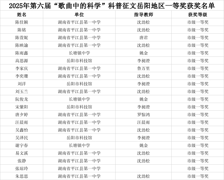 近日,全国第六届“歌曲中的科学”科普征文活动评选结果正式揭晓,岳阳市参赛作品表现优异、斩获佳绩,共有90件作品获评市级奖项,具体为一等奖21项、二等奖45项、三等奖24项(岳阳地区一等奖名单附于文后)。据了解,本次活动由科普时报社、中南大学科学技术协会、湖南省科普作家协会等单位联合主办,核心目标在于推动科学与艺术深度融合,激发广大青少年及社会公众的科普创作热情、培育创新思维。
