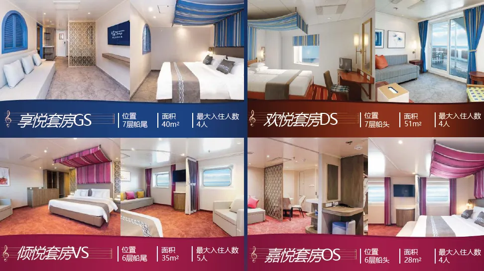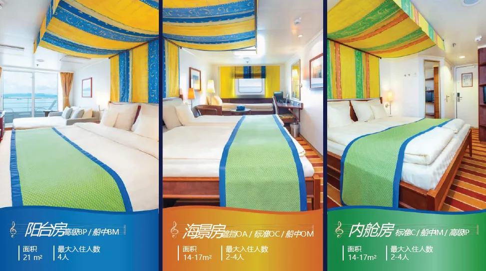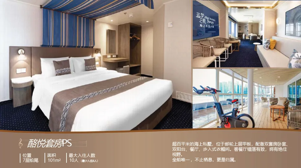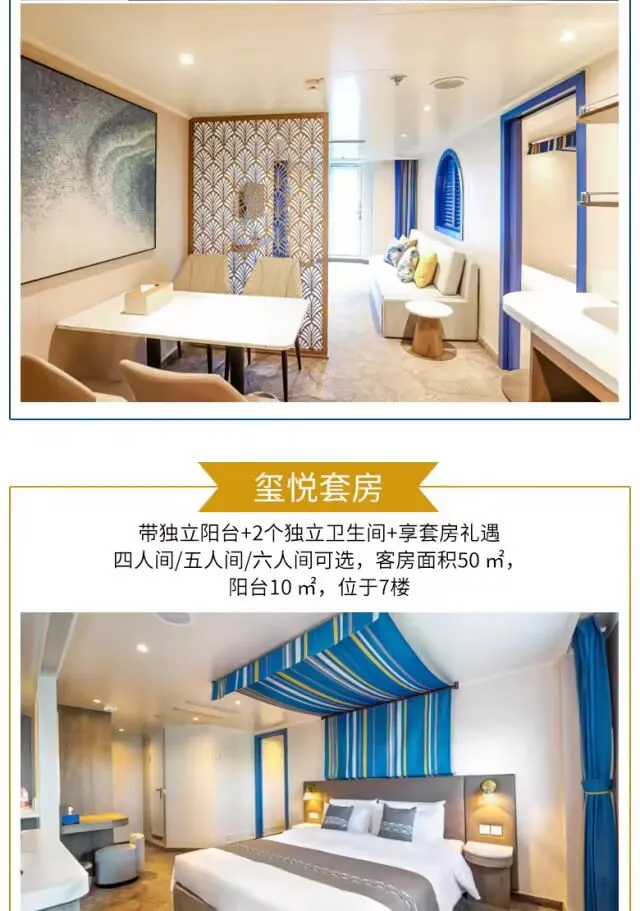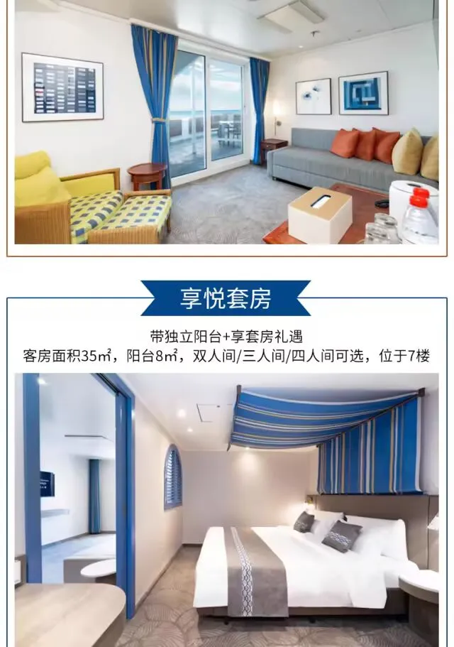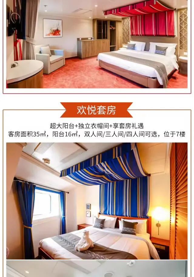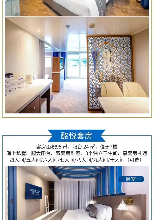 乐活悦己:“蓝梦之歌号” 邮轮护航,多种舱房可选,红宝石厨房、浪漫曲餐厅享多国美食,剧院秀、甲板派对、汗蒸馆等免费设施,主打 “主动悦己” 乐活体验;