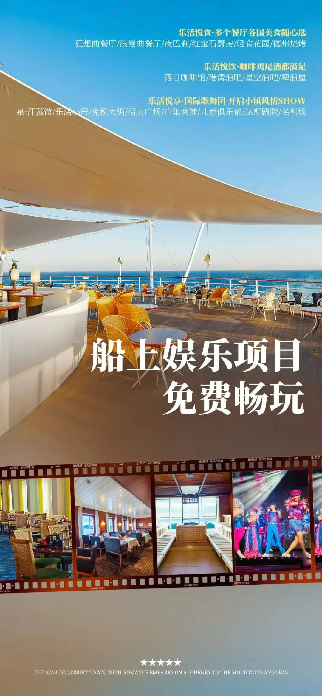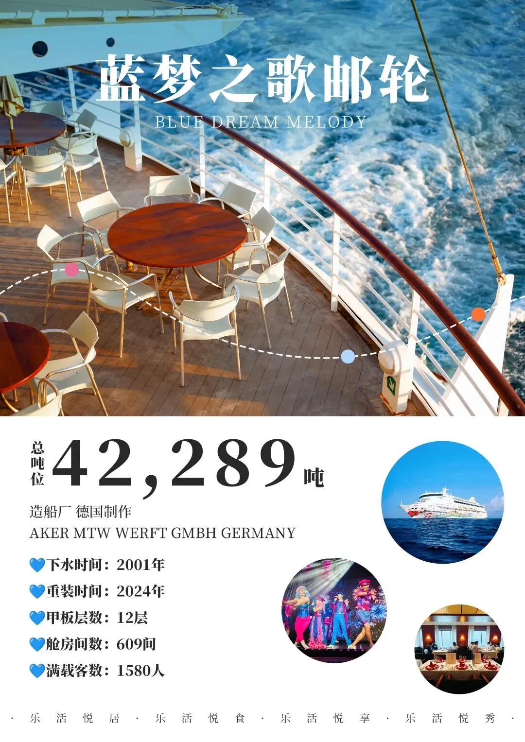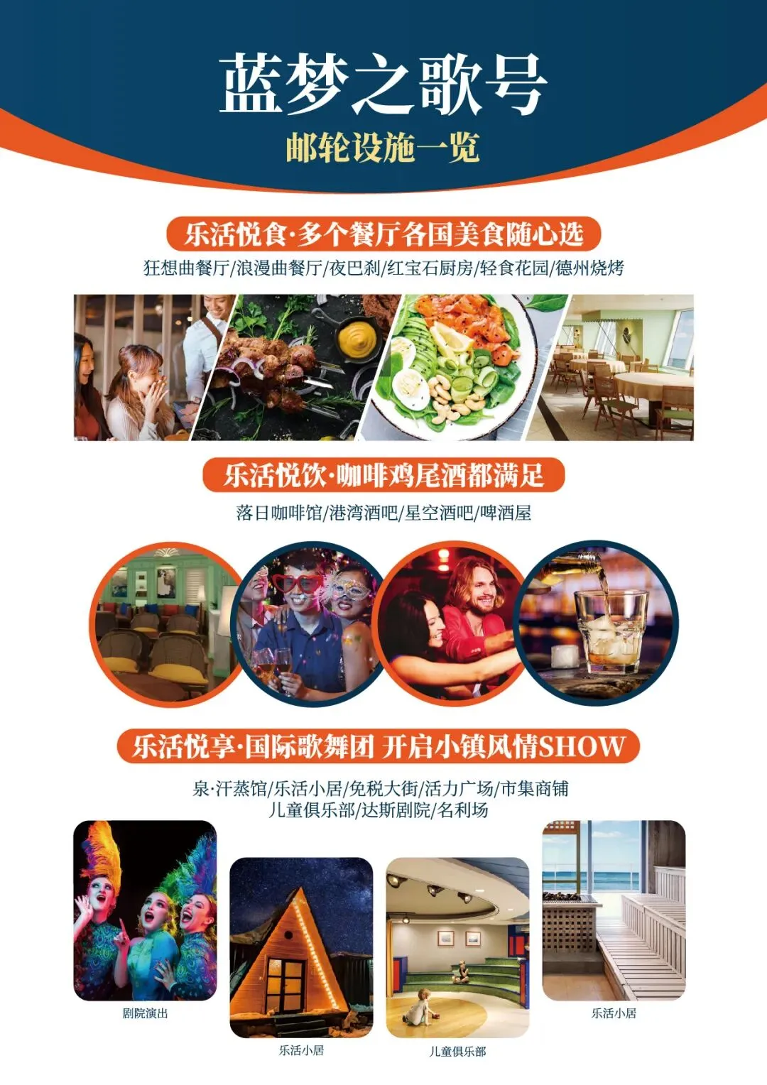 乐活悦己:“蓝梦之歌号” 邮轮护航,多种舱房可选,红宝石厨房、浪漫曲餐厅享多国美食,剧院秀、甲板派对、汗蒸馆等免费设施,主打 “主动悦己” 乐活体验;