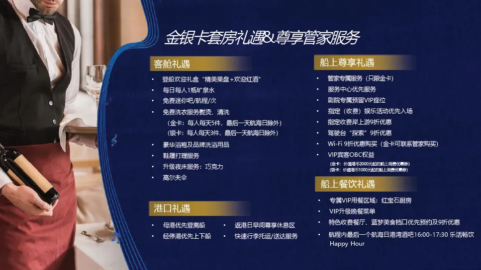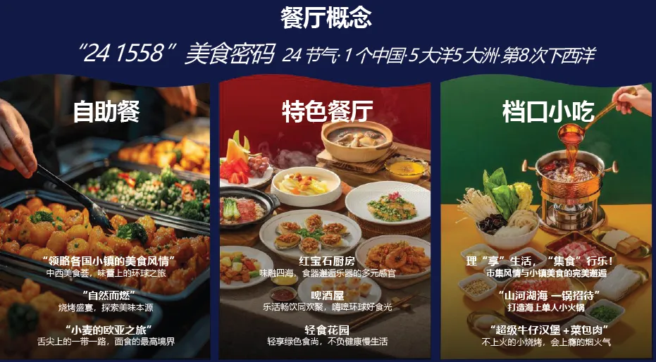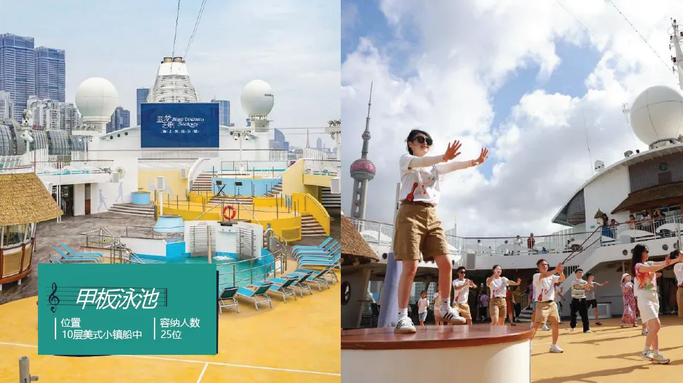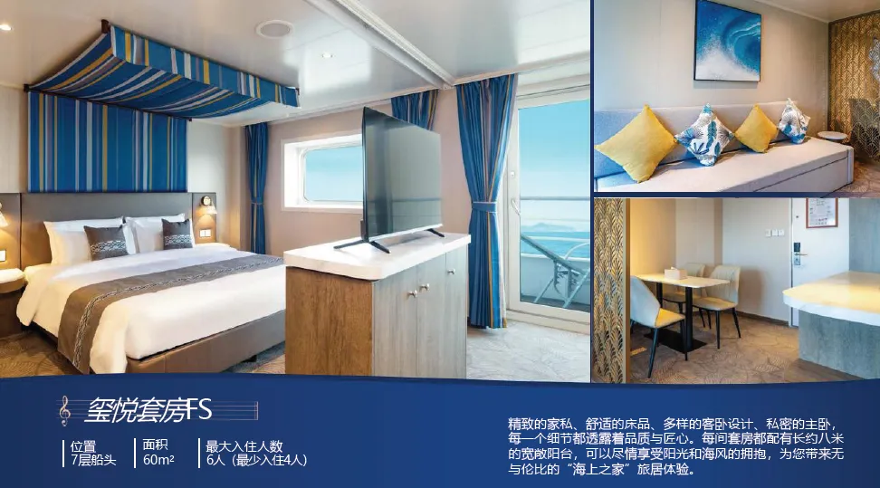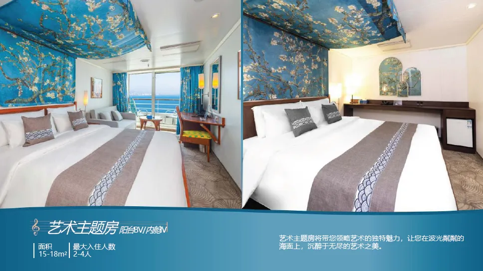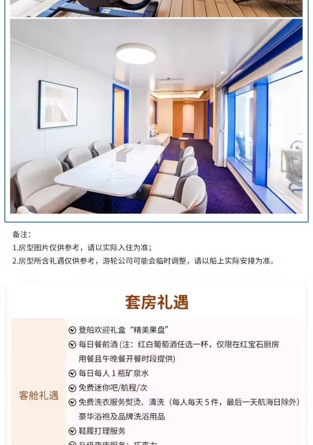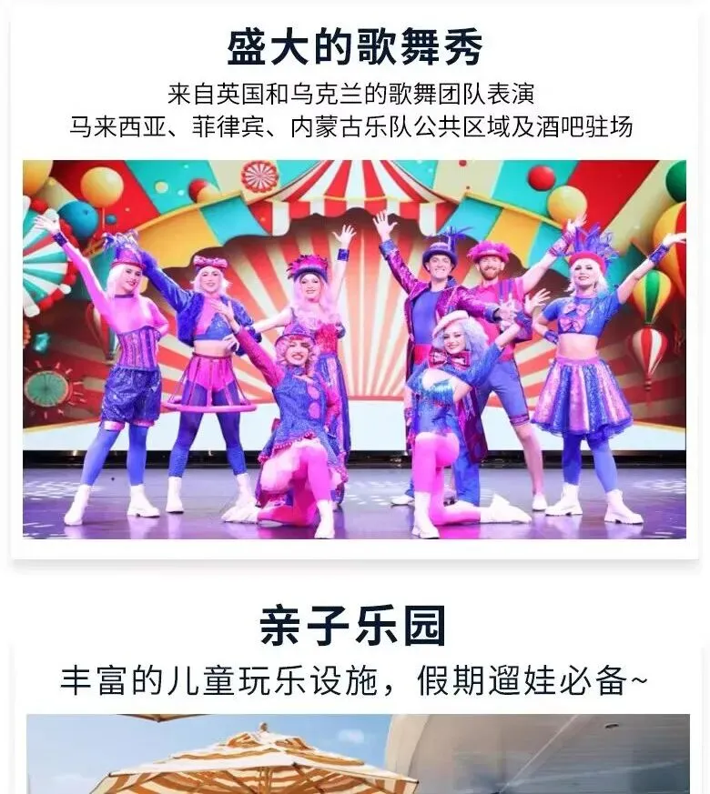 当清晨的第一缕阳光洒在海面上,金色的波光闪烁唤醒人们沉睡的心灵。当您站在甲板上,微风轻拂脸颊,带来大海的气息让人心旷神怡,没有城市的喧嚣和工作的压力,您可以在泳池边享受悠闲的时光,让清凉的水带走一切疲惫;也可以在舒适的躺椅上,读一本好书让思绪在文字间自由飞翔;或者品尝来自世界各地的美食佳肴,让味蕾在舌尖上舞动。