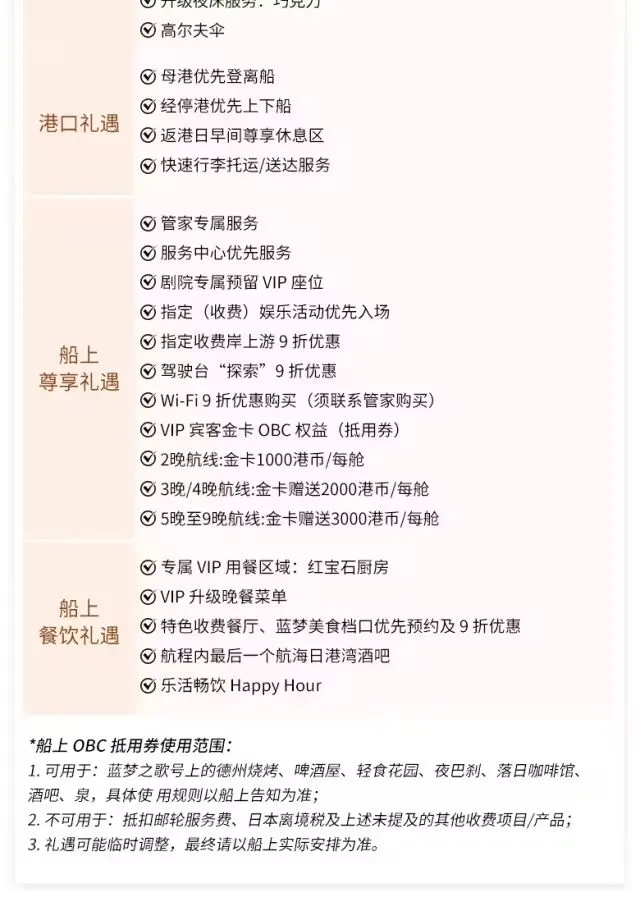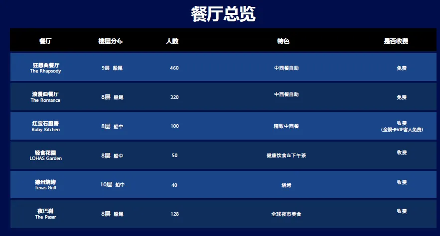 2、用餐:邮轮上指定提供的所有免费餐食(特别注明收费的除外);