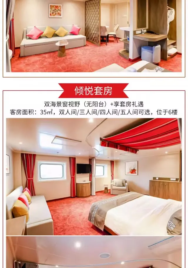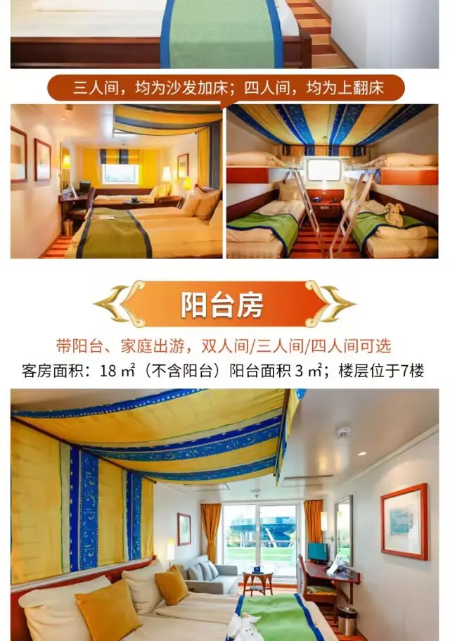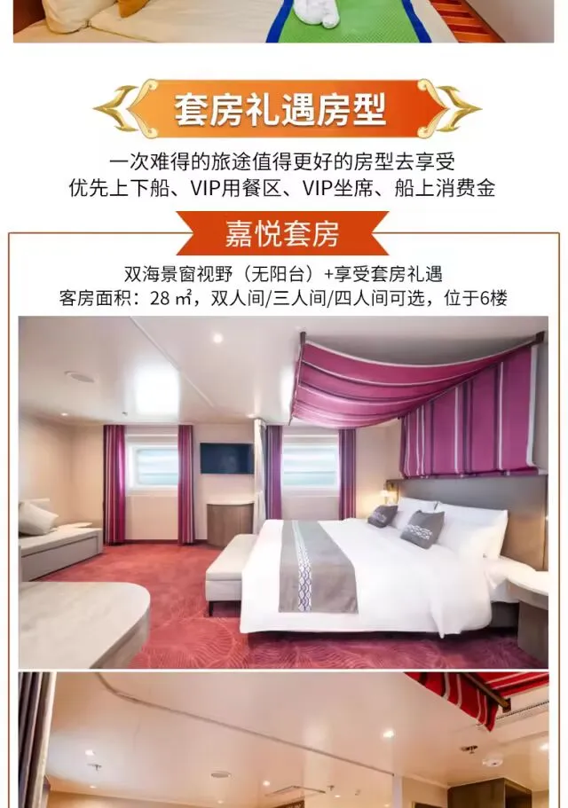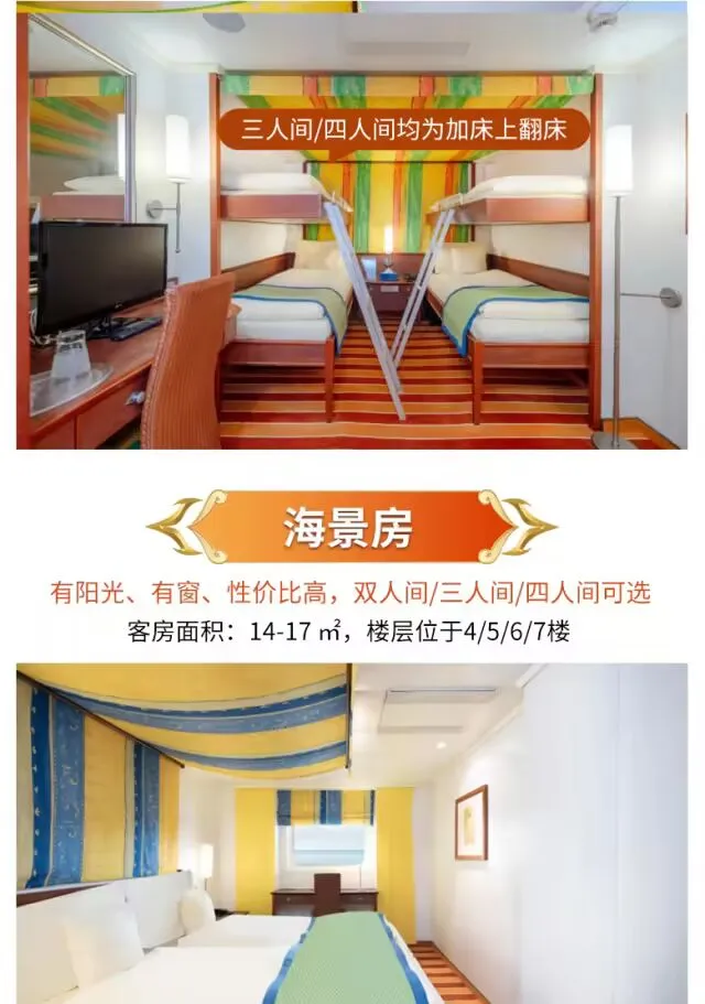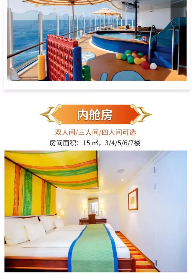 美食美景相伴,衣食住行无忧,多种房型可供选择,🚢体验邮轮高大上的吃喝玩乐。
