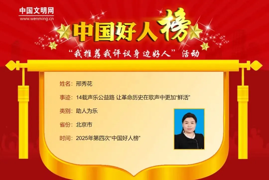 房山区霞云岭乡是《没有共产党就没有新中国》词曲的诞生地,生于斯长于斯的邢秀花早已将爱党爱国的基因深植血脉。2011年起,任音乐教师的邢秀花,常常利用休息时间为霞云岭乡排练《到吴起镇》《大海航行靠舵手》《戏曲联唱》,现代京剧《红灯记》选段《都有一颗红亮的心》,让传统旋律焕发时代活力,用歌声传递坚定的信仰。她始终将志愿奉献视为另一个讲台,用专业与热忱默默耕耘,在每一次辅导和公益演出中,践行着传播红色文化的使命,也点亮了基层群众的精神生活。