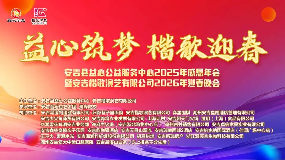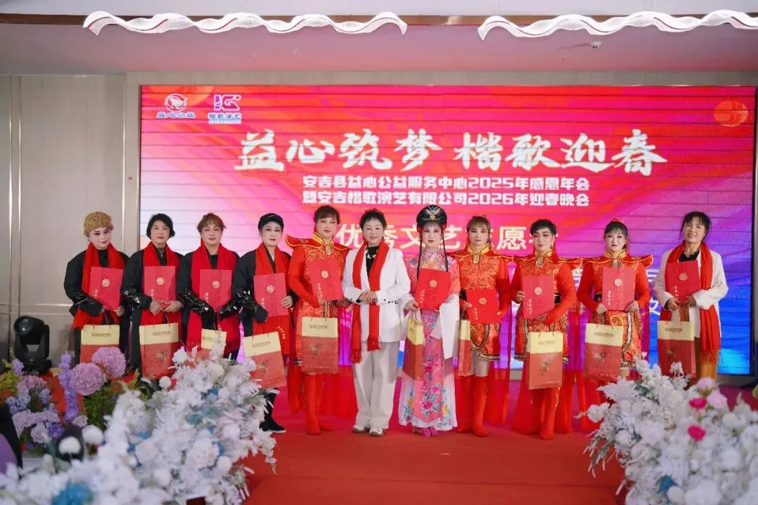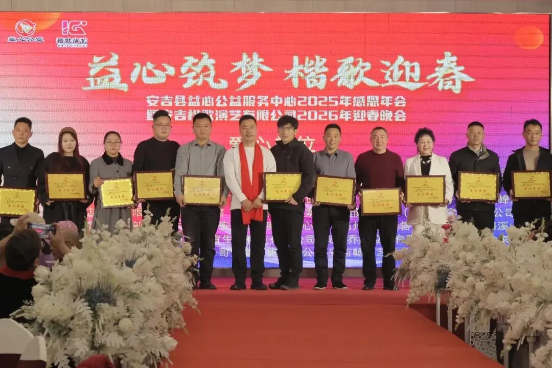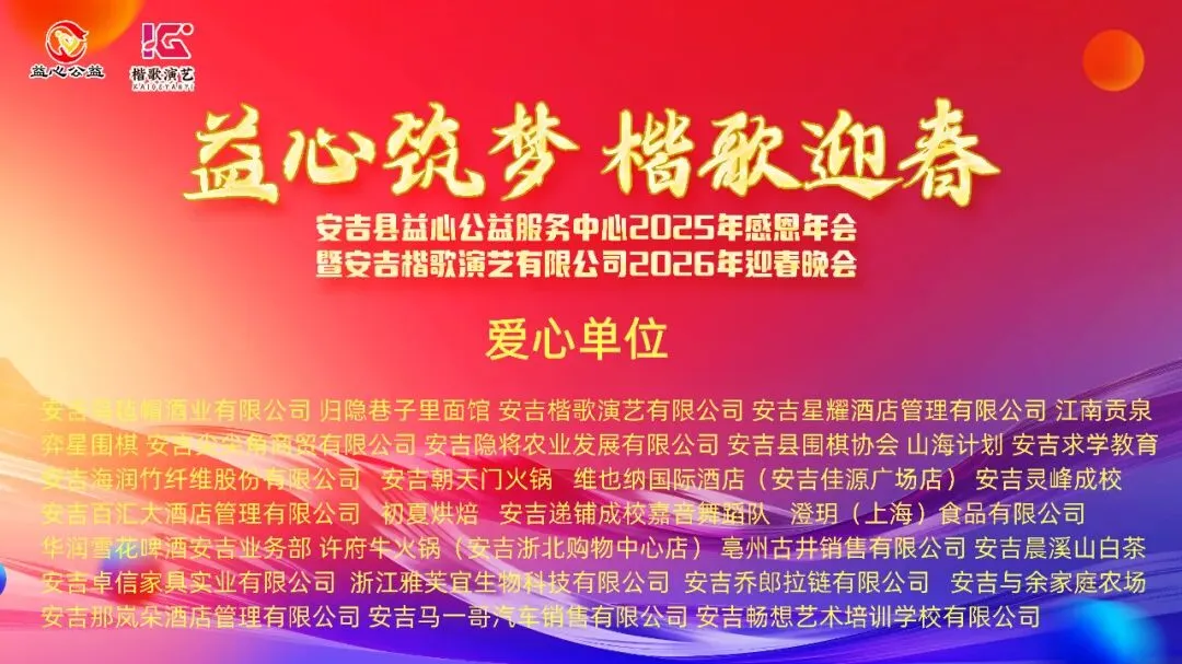 时光荏苒,岁末将至。当街灯缀满红绸,当空气弥漫年味,1月24日晚上“益心筑梦,楷歌迎春”安吉县益心公益服务中心2025感恩年会暨安吉楷歌演艺有限公司2026年迎春晚会在遇花园宴会中心圆梦落幕。