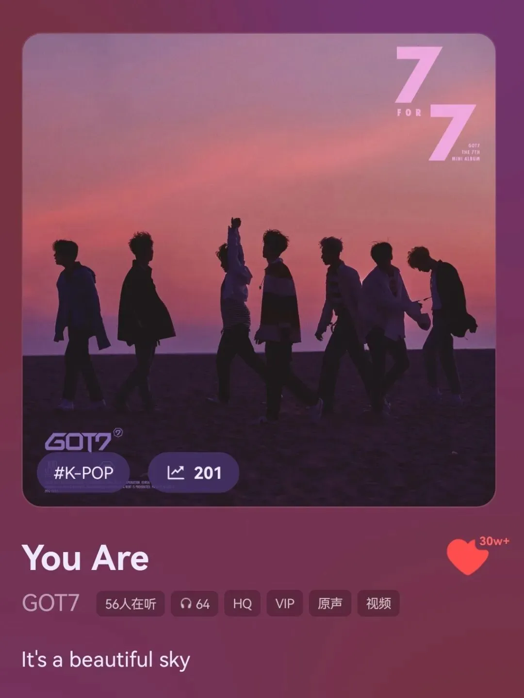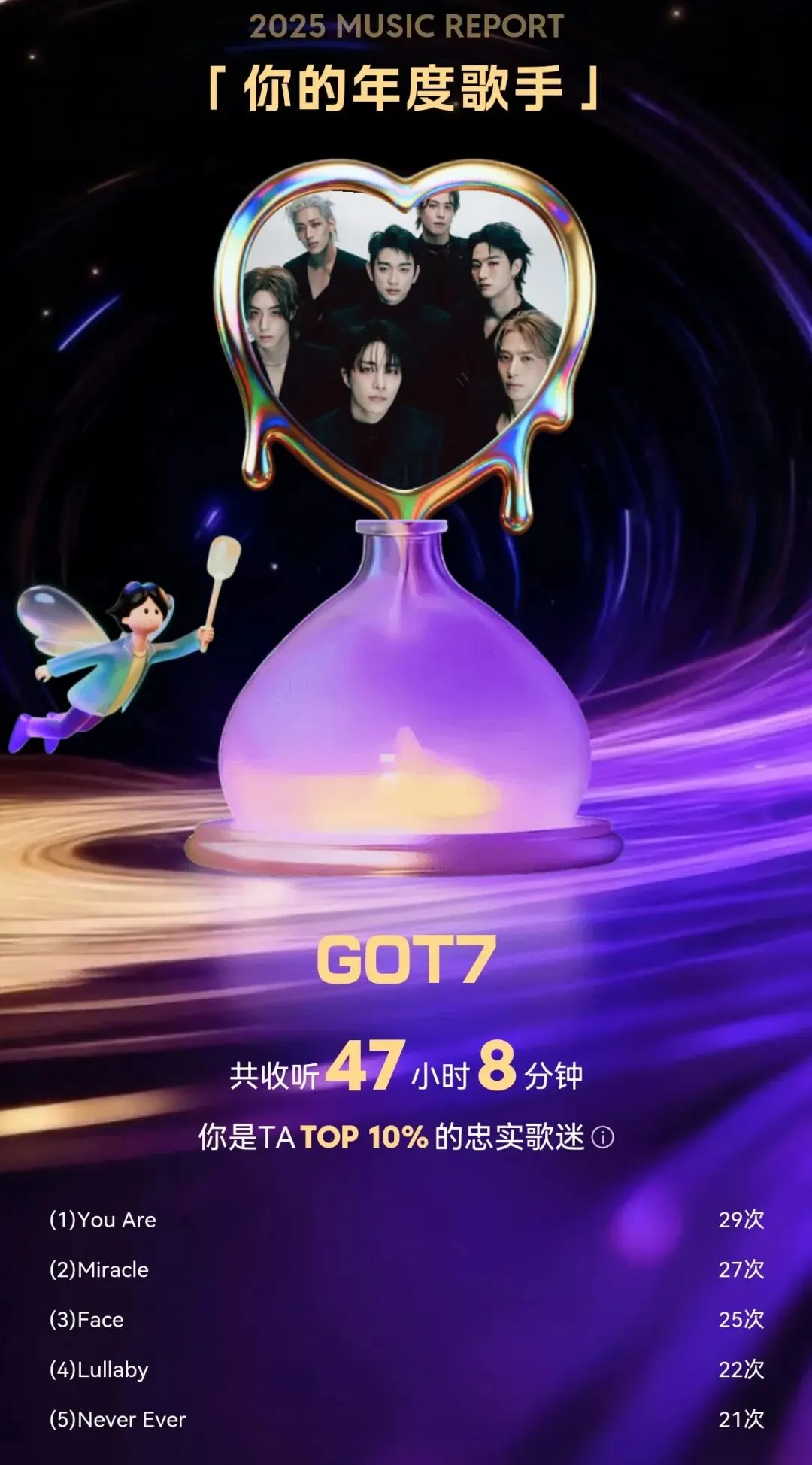 25年太喜欢听GOT7以至于把他们听成了我的Q音年度歌手。最喜欢的一张专辑是《7 for 7》,整张专辑都是绚烂而浪漫的。