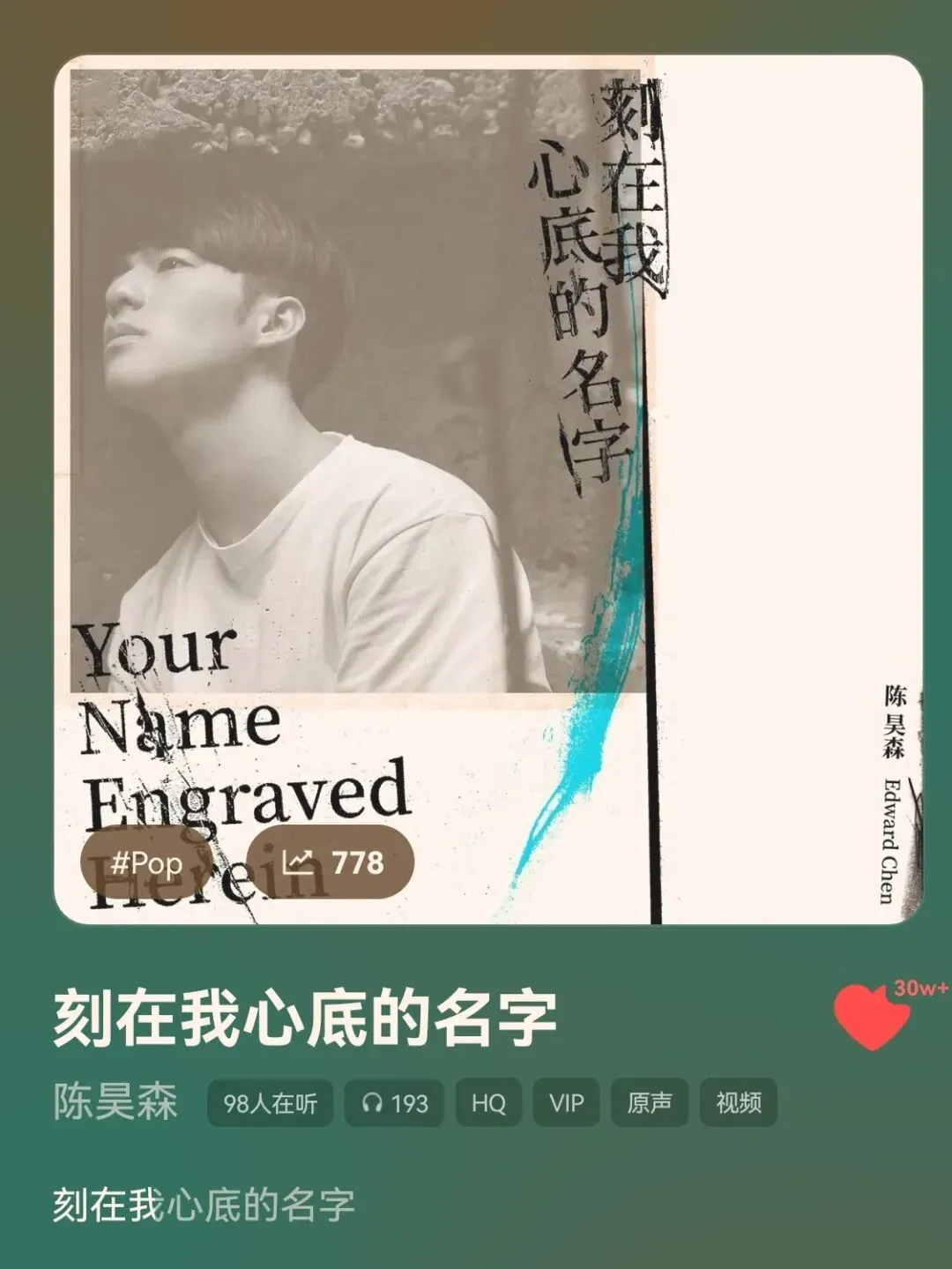 在《永远的第一名》听到这首歌之后马上就爱上了!《刻在我心底的名字》和《水蓝色情人》是台腐最好听的两首歌!