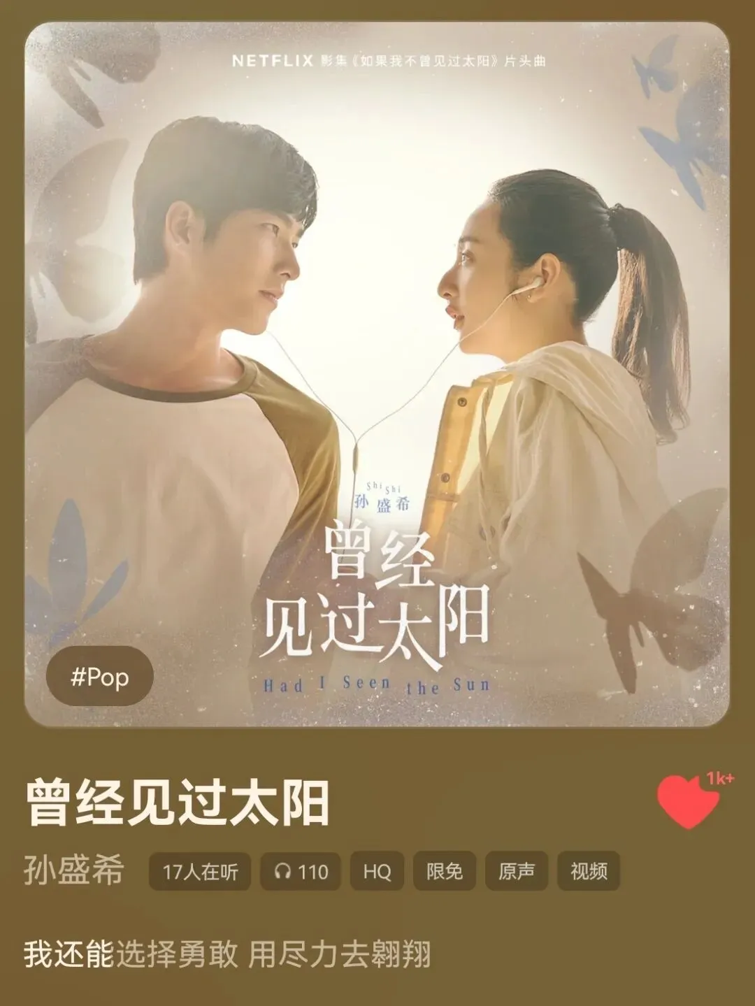 虽然我一直在吐槽《如果我不曾见过太阳》,但这首片头曲实在是太好听了。第一次听到片头曲就感觉很熟悉,音源释出后一看果然是孙盛希!
