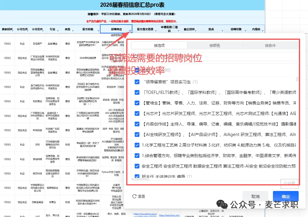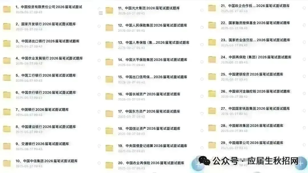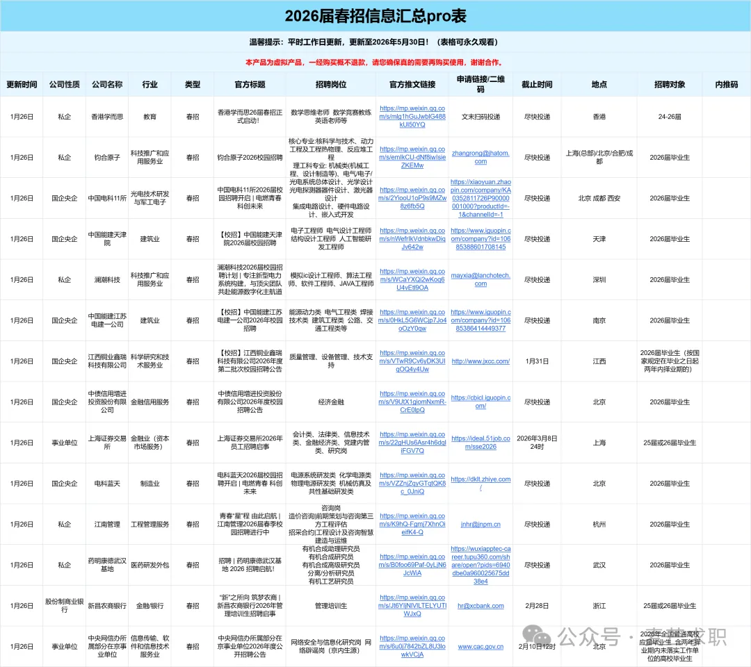 .................... 其他岗位汇总 2025-2026年度会员将获得25个+招聘汇总表权益,每个表格将持续更新到周期结束 覆盖行业全面:银行/证券/基金/保险/期货/互联网/电子商务/计算机软件/通信/国家机关/高校/研究所/事业单位 /教育/会计师事务所/咨询公司/法律/消费品/零售/服装/家具/贸易/制造业/汽车/电子/电器/机械/石油/钢铁/电力/能源/煤矿/化工/生物/制药/医疗/农林/畜牧/媒体/广告/旅游/公关/文化/影视/酒店......... 同时还有企业性质细分,包含国企、民企、外企等。 个性化筛选:所有信息均支持自主筛选,行业-企业-截止时间-投递链接-工作地点…,分门别类,一目了然,既能海投,又能精准投递。 每周校招截止提醒⏰:每周截止校招专属提醒,不错过任何一个机会! 信息差,是影响大部分同学就业的关键因素! 上一届校招(秋招+春招)期间, 共计汇总企业10000+ 订阅人数10000+ 包括国央企、事业单位、民企、外企、合资企业......。