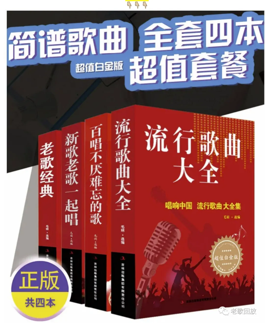(流行歌曲大全+百唱不厌难忘的歌+ 新歌老歌一起唱+老歌经典 ) 四本原价199.2元的书, 如今新春特价五折销售只要99.6元! 我已经听到你的心动之声了, 快来抢购,售完即止! 点击左下方“阅读原文”,即可在邮政小铺微店订购!