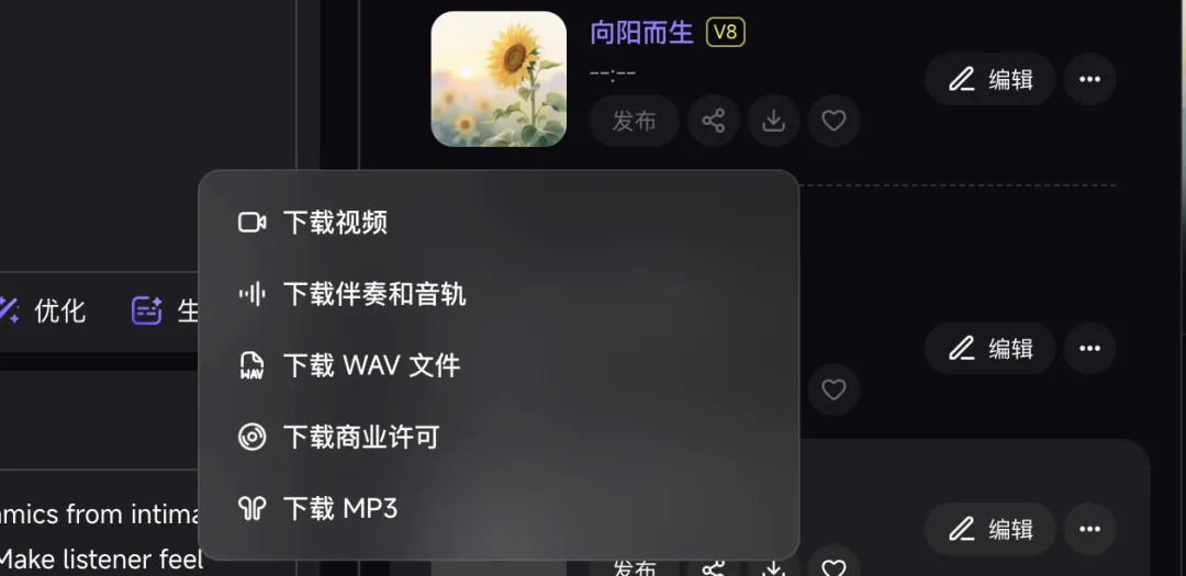 这次创作的是一首积极向上的歌曲,下载的时候,我选择了MP3格式,实际上Mureka V8在创作完成之后,还支持非常多其他的功能。比方说下载的时候就可以选择视频格式、伴奏和音轨、WAV文件、MP3文件等等。