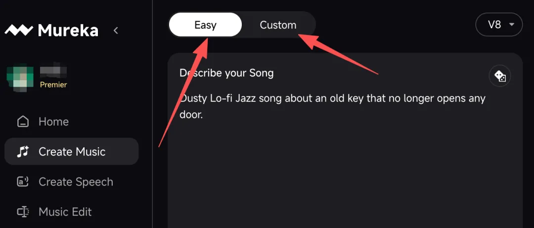 但是这种方式对于使用门槛还是高了一些。Mureka V8为了降低创作门槛,实际上也提供了更简单的音乐创作方式。