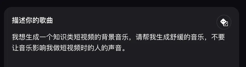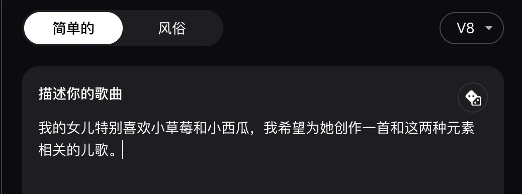 在简易模式下,我输入的提示词非常简单,只有上面的这两句话,关于音色、旋律、具体的歌词等等,都没有做详细的要求。