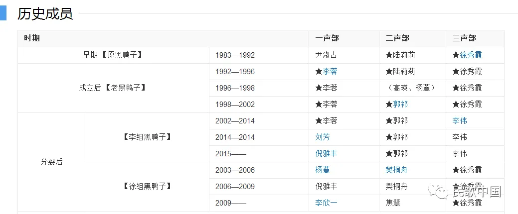 如果不是要策划和分享这两期“黑鸭子组合”的内容,民歌君也不知道黑鸭子组合背后的故事,竟如此的精彩和复杂。由于时间、篇幅、资料等方面的局限性,文章难免有疏漏和瑕疵,有劳大家帮忙指出。最美和声!听黑鸭子组合演绎的经典老歌(一)推出以后,有咱们民歌中国的朋友提出:文中配图未出现全部黑鸭子组合成员;文中关于黑鸭子组合的介绍不够全面等。民歌君对大家表示感谢。在此,将一份成员变化表格附上,供大家了解和参考。