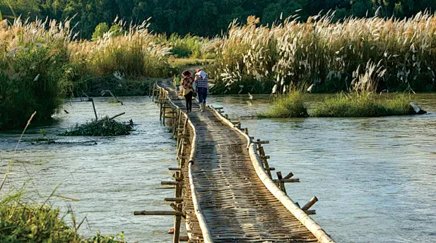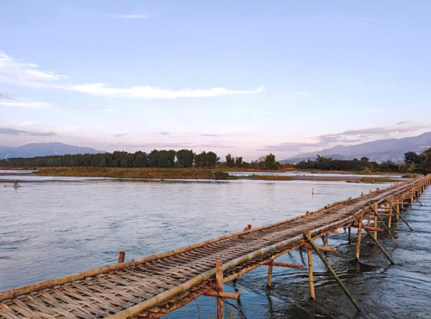 我们一起跳目瑙纵歌、品景颇水酒、尝过手米线、赏非遗技艺、享节日放松。载歌载舞,好不热闹。适时,我们离开陇川,到达另外一个美丽的边境小城—【盈江】,先打卡大盈江江面上的【网红竹桥】,当地傣族村民用最原始的方式,编织出了横跨两岸方便行人和摩托车通行的竹桥,300米长凝结傣族村民生活智慧的江上竹桥不仅方便了两岸往来,更成了盈江上不可多得的一道自然美景。这里也成为了又一个小众打卡网红地。