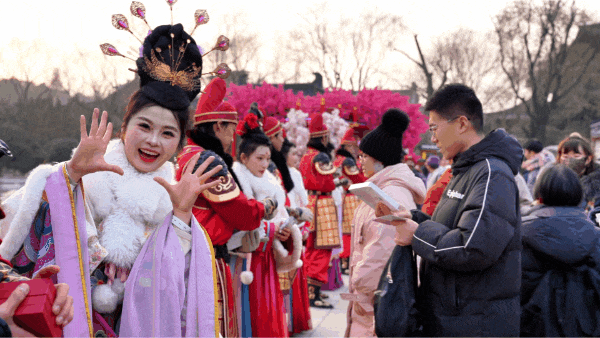 为进一步提升观众参与感,本次升级特别设计了常态化的演前互动环节“开演即相遇”。首演当日,盛唐主题花车巡游率先点燃现场气氛,唐宫NPC化身为“行走的长安符号”,穿梭于游客之间,在热情互动中重现长安街市的烟火气象,吸引众多游客纷纷驻足留影。现场还通过大屏互动问答等形式,巧妙传递唐文化知识,将候场时间转化为文化体验。