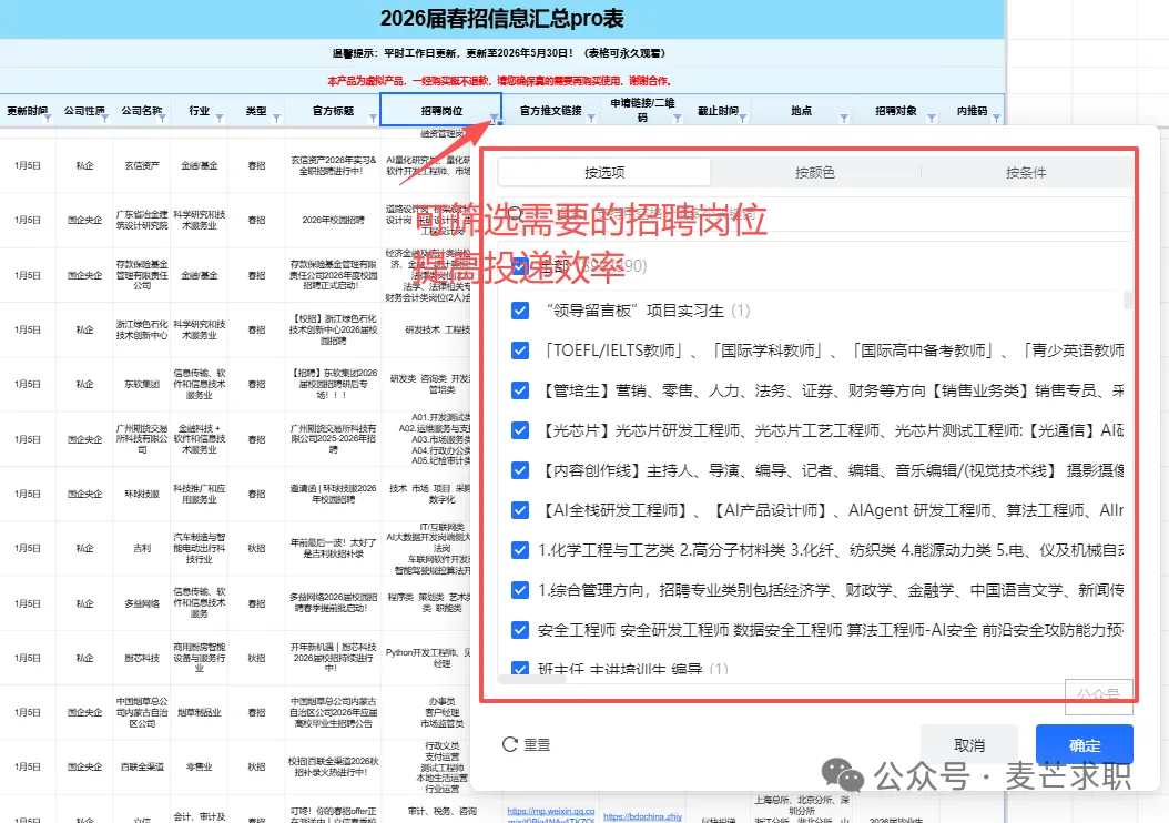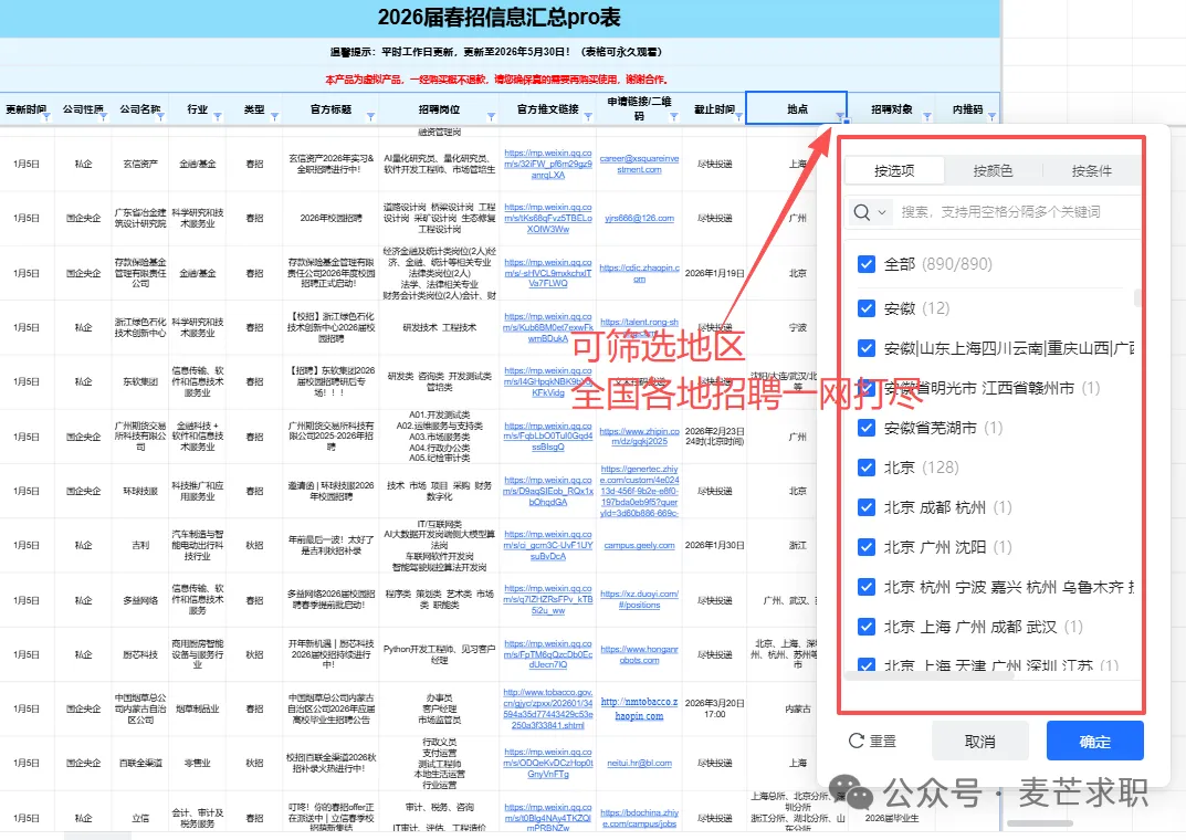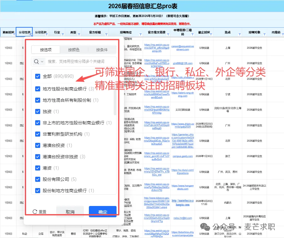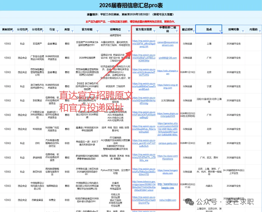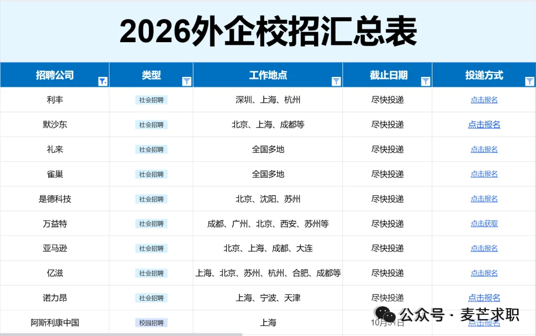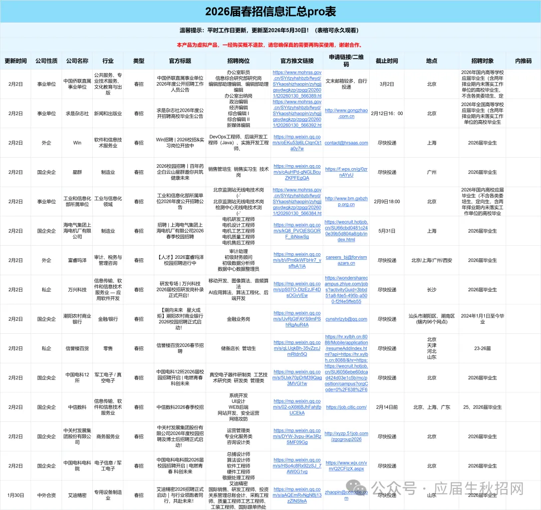 .................... 其他岗位汇总 2025-2026年度会员将获得25个+招聘汇总表权益,每个表格将持续更新到周期结束 覆盖行业全面:银行/证券/基金/保险/期货/互联网/电子商务/计算机软件/通信/国家机关/高校/研究所/事业单位 /教育/会计师事务所/咨询公司/法律/消费品/零售/服装/家具/贸易/制造业/汽车/电子/电器/机械/石油/钢铁/电力/能源/煤矿/化工/生物/制药/医疗/农林/畜牧/媒体/广告/旅游/公关/文化/影视/酒店......... 同时还有企业性质细分,包含国企、民企、外企等。 个性化筛选:所有信息均支持自主筛选,行业-企业-截止时间-投递链接-工作地点…,分门别类,一目了然,既能海投,又能精准投递。 每周校招截止提醒⏰:每周截止校招专属提醒,不错过任何一个机会! 信息差,是影响大部分同学就业的关键因素! 上一届校招(秋招+春招)期间, 共计汇总企业10000+ 订阅人数10000+ 包括国央企、事业单位、民企、外企、合资企业......。