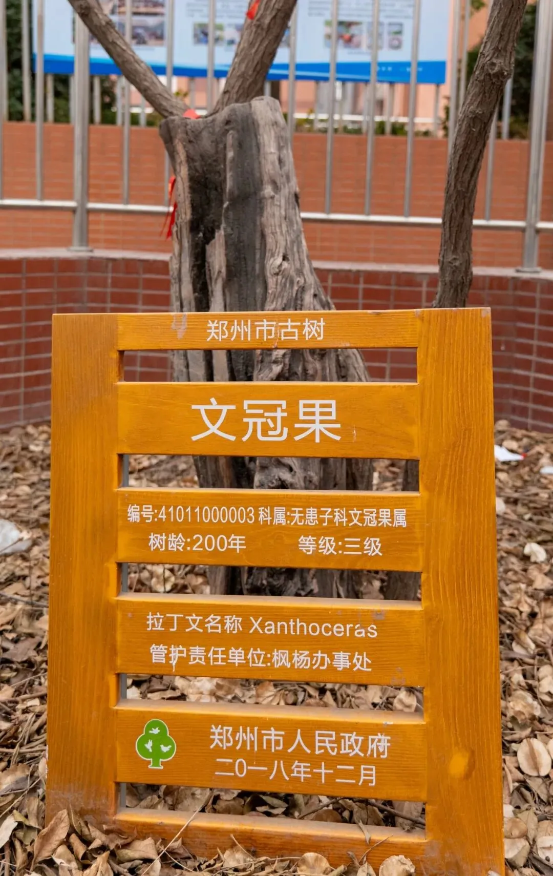 中原区高新社会事务中心公共事业部的张慧丽介绍,为了保护这棵树,村里专门拨款建起不锈钢围栏。“刚开始是钢丝网,护了四年,等新枝足够强壮,才换成现在的钢栏。”