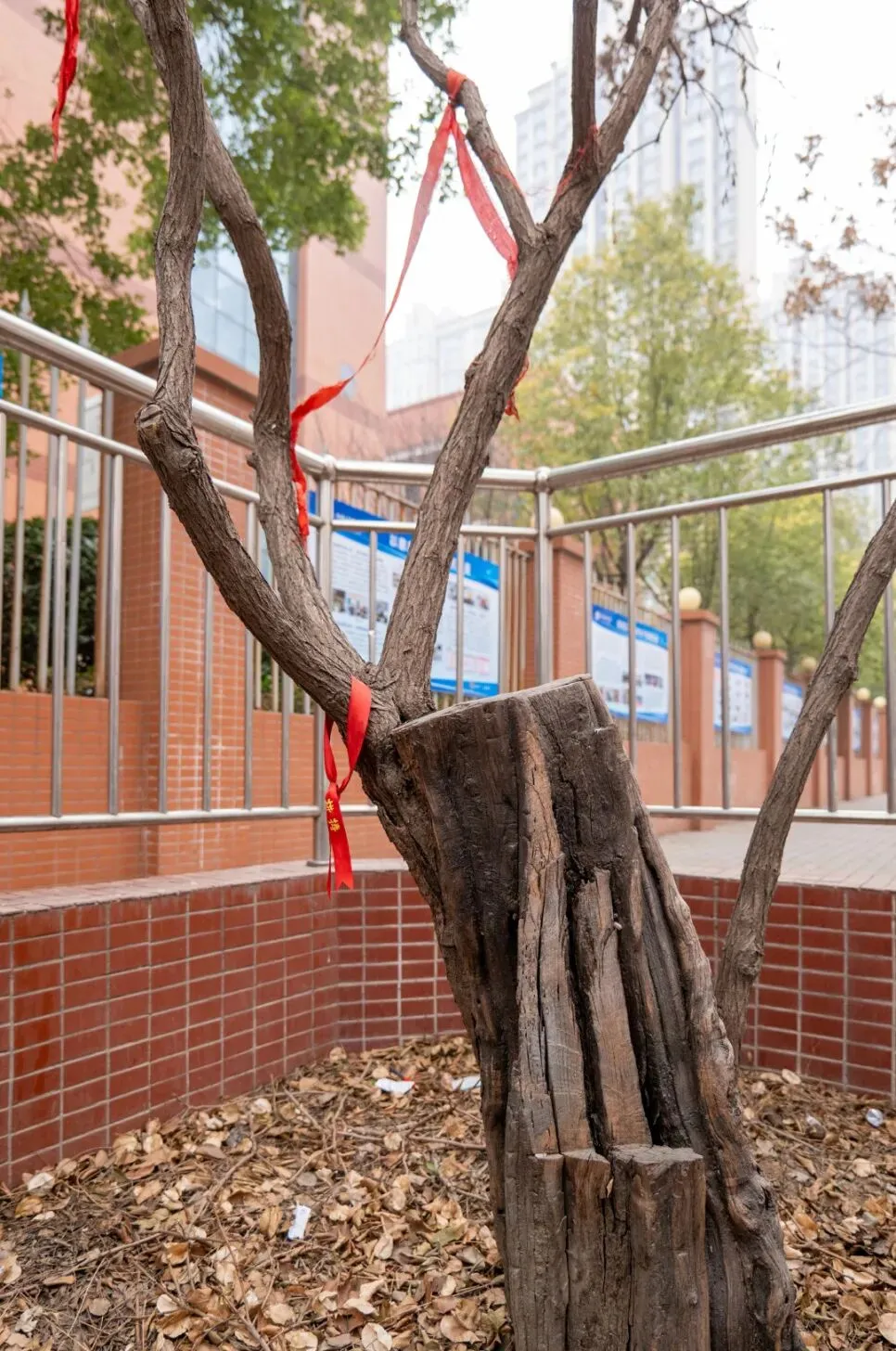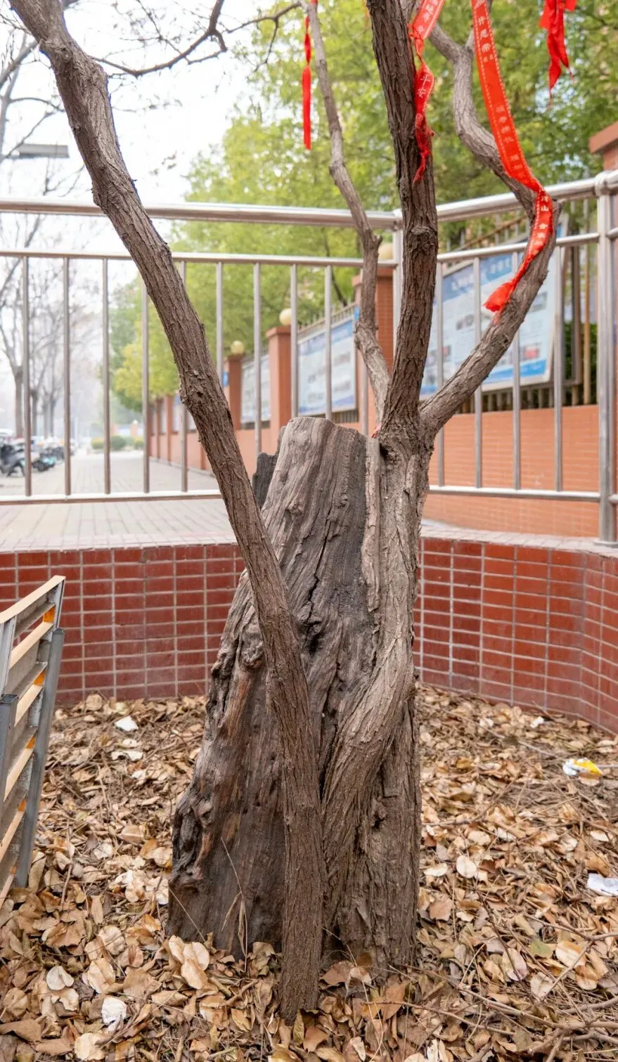 树枝上系了很多红绸带。“都是附近学生来系的,”毛大爷说,“高考的、中考的、考编的……都来沾沾喜气。”