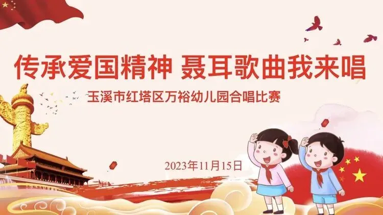 为认真贯彻落实习近平总书记关于讲好“聂耳和国歌的故事”的重要指示精神,让全园师幼进一步传承红色基因,赓续红色血脉,用心用情用力讲好“聂耳和国歌的故事”,持续擦亮“聂耳故乡、红色之城、音乐之都”名片,让聂耳精神薪火相传、生生不息。我园于2023年11月15日开展“传承爱国精神 聂耳歌曲我来唱”校园合唱比赛,本次比赛采用“1+1”的模式,传唱中华人民共和国国歌和一首聂耳创作的音乐作品《卖报歌》。