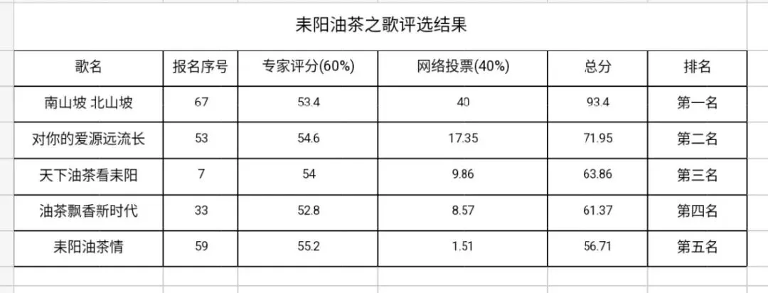 为确保评选工作公开、公平、公正,本次评选严格按照专家专业评分、网络公众投票相结合的方式综合评定,经多轮审核、综合比选,最终确定耒阳油茶歌曲征集活动获奖作品名单。现将评选结果予以网络公示,公示期间,社会各界可对结果进行监督,若有异议,请以书面形式并附相关佐证材料向活动主办方提出。