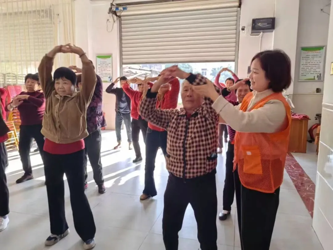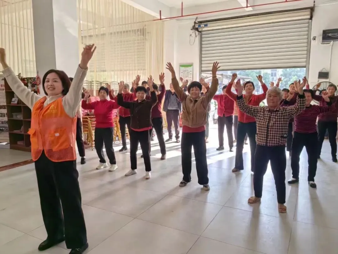 跳操时间,伴随着轻快的音乐,长者们舒展筋骨、整齐律动,在适度运动中感受快乐。