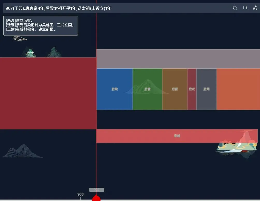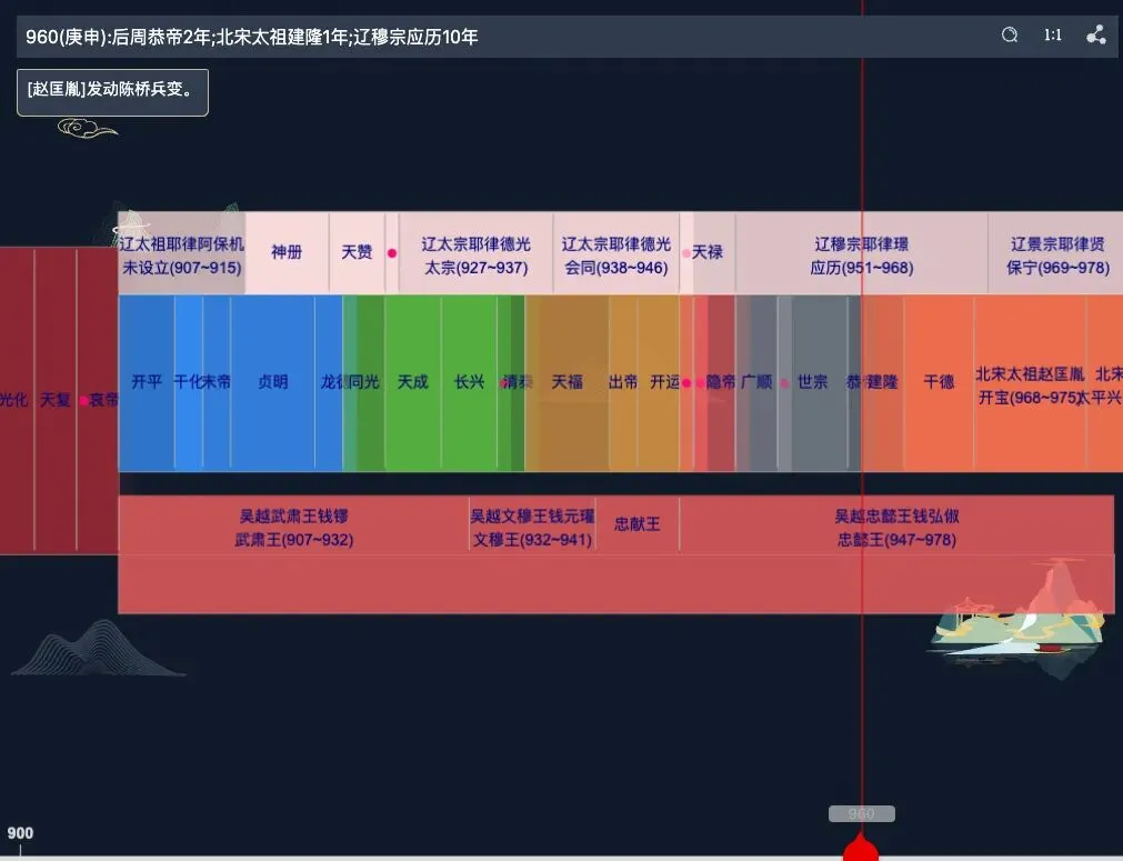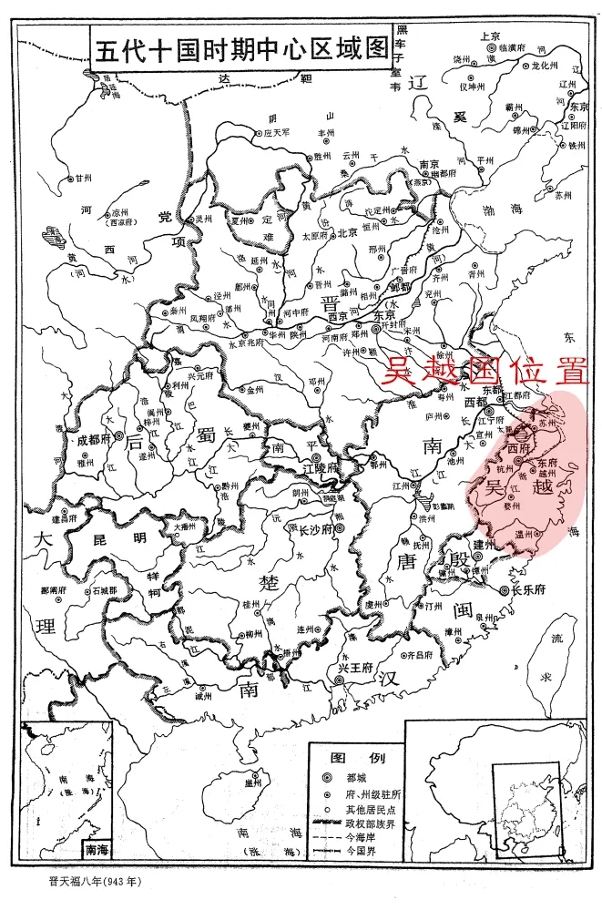 吴越国的地理位置大致包括我们今天的浙江省、上海市以及苏州市(包括:昆山市)等环太湖的城市。得益于吴越国国王钱镠(liú)的“保境安民”的基本国策,在整个“五代十国”时期,吴越国百姓的生活相对还是比较和平安宁的,“太平年”这部剧中的钱弘俶(chù)就是吴越国的最后一任国王。“自古”到底从哪里开始?我们可以看一下这一时期的“王朝更替时间图谱”。从图中可以看出,整个五代十国时期,北方政权更替频繁,而吴越国一直在钱王的经营管理之下。也就是说,从白居易在杭州城写下“孤山寺北贾亭西,水面初平云脚低”,到他回到洛阳写下“江南忆,最忆是杭州”,到宋朝的柳永写下“烟柳画桥,风帘翠幕,参差十万人家”,到苏东坡写下“水光潋滟晴方好,山色空蒙雨亦奇”,杭州城一直都是和平安宁的。为什么是吴越国? 五代十国时期,除了北方的政权之外,南方不是也还有一堆的小国吗?为什么相比较而言,吴越国能在这乱世中能独守这一份相对的繁华?简单讲就是相比于其他政权,钱王对整个形势的判断比较准,没有那么“作”,把主要精力放在治理钱塘江等民生大事上。我们可以从钱镠(liú)的话中看出整个吴越国的基本国策:“子孙善事中国,勿以易姓废事大之礼。”