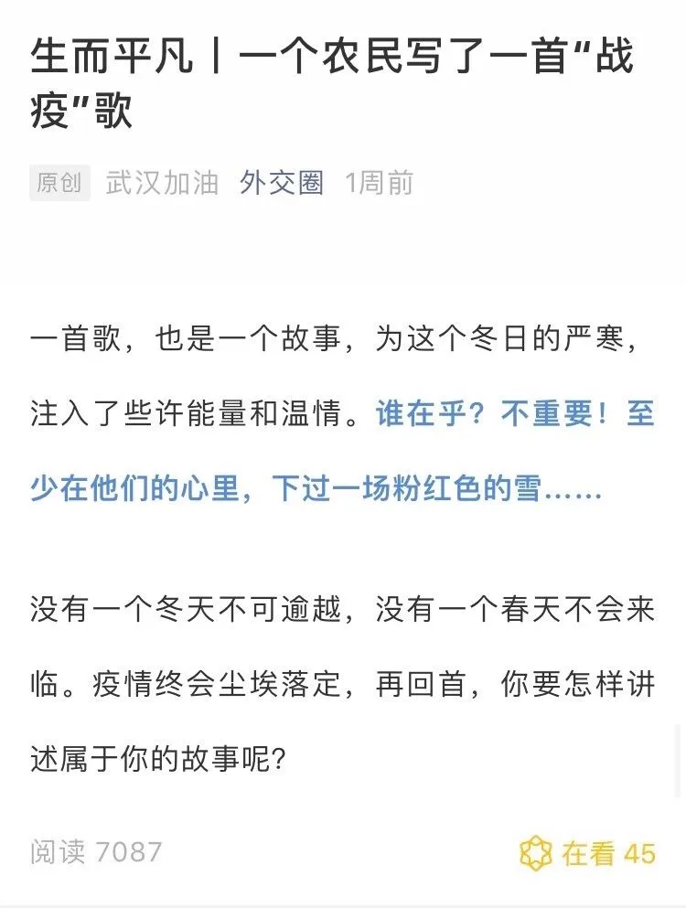 歌是做好了,但总觉得事还没办结:姜楠没有得到应有的报酬、保金叔没能拿到更精美的歌曲,似乎两边都没啥“获得感”,自己心里别扭了好几天。2月14日那天中午突然灵光乍现:可以把《战疫》诞生的故事写下来然后找个公众号发稿!这样能让更多人听到保金叔的歌!还能把姜楠的原创音乐人账号放进去帮她拉粉丝!顺便再录一个好音质的版本!……我的出发点是纯功利的,但这个功利的意图竟幸运地找到了一个有情怀有温度的热心人。几乎是在我决定托人写稿的那一刻,我就想到了旁边办公室的一位小哥哥,不知道为啥,我觉得就他肯定愿意写,肯定能写好。他答应得很爽快,花了整个周末的时间写作、调整、修改,2月16日晚,署名“武汉加油”的原创侧记《生而平凡|一个农民写了一首“战疫”歌》发在了只有56个粉丝的“外交圈”公众号上,小哥哥说,“这也算是为抗疫做了些什么吧,我挺高兴的”。