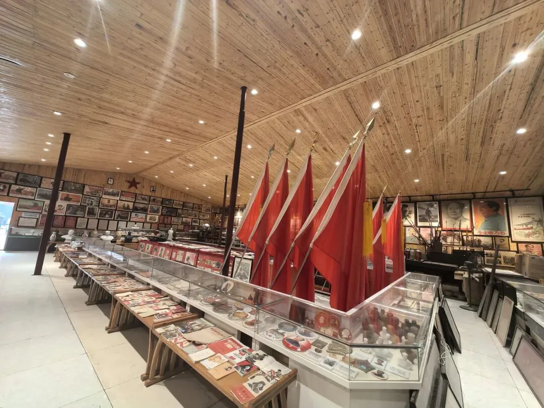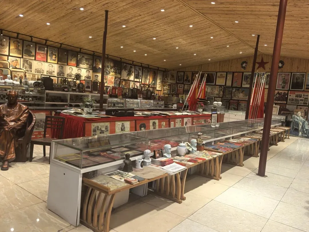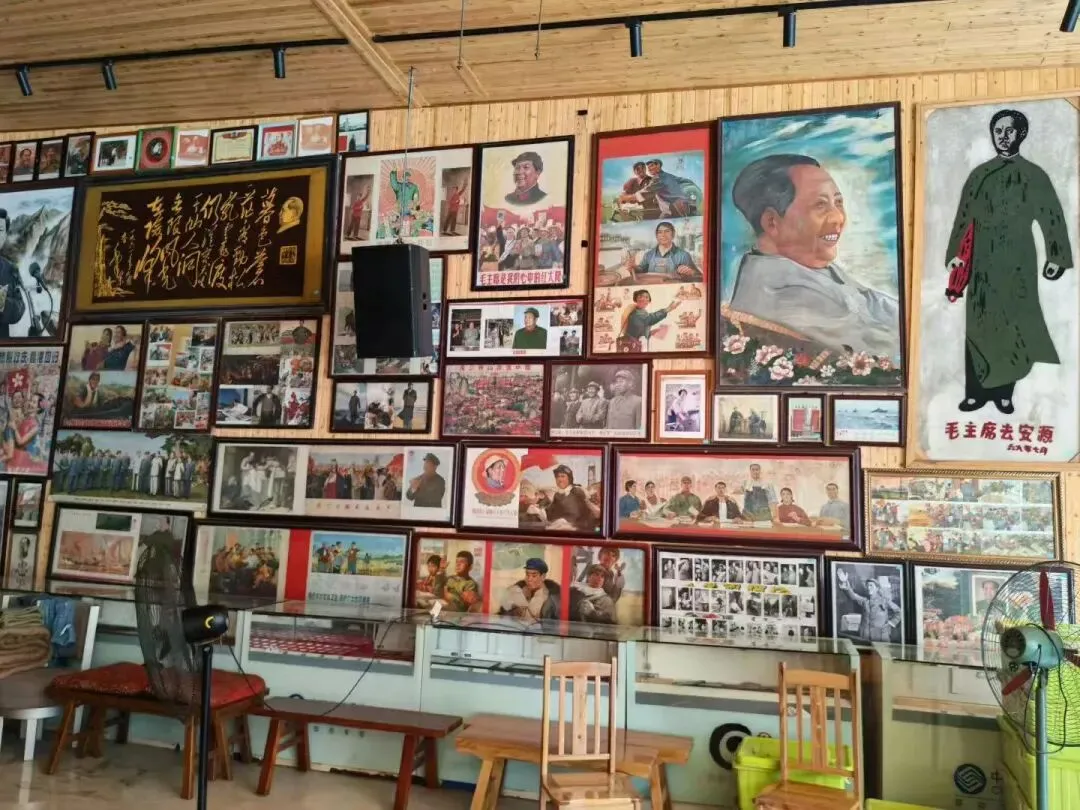 镀着金字的各类奖杯在展架上排列,杯身的光泽凝着奋斗与竞赛的荣光,那是岁月里的拼搏与坚守,是一代人用汗水浇灌年轻共和国的成果;经典艺术品性的瓷瓶静静安放在“红色记忆”的海洋 瓶身的图案中,或山河、或箴语,瓷釉的温润里藏着艺术与哲思的雅致,也藏着人文的情怀。每一个瓷瓶,都是时光的容器,装着岁月的故事,装着艺术的价值与不变的信仰。墙壁上贴成版面的老式年画,当年那可是“风雨归来”后眼眸的熨贴,是“披星戴月”耕种收获后一个院落的温暖。那些绘着工农兵并肩前行、绘着革命岁月里的美好期盼的年画,是时代的缩影,是红色记忆的具象。工业学大庆,农业学大赛,向雷锋同志学习,学风仍浓,灵魂永生,在洞庭的湖光里漂洗温色后守着一方天地的温暖与赤诚。