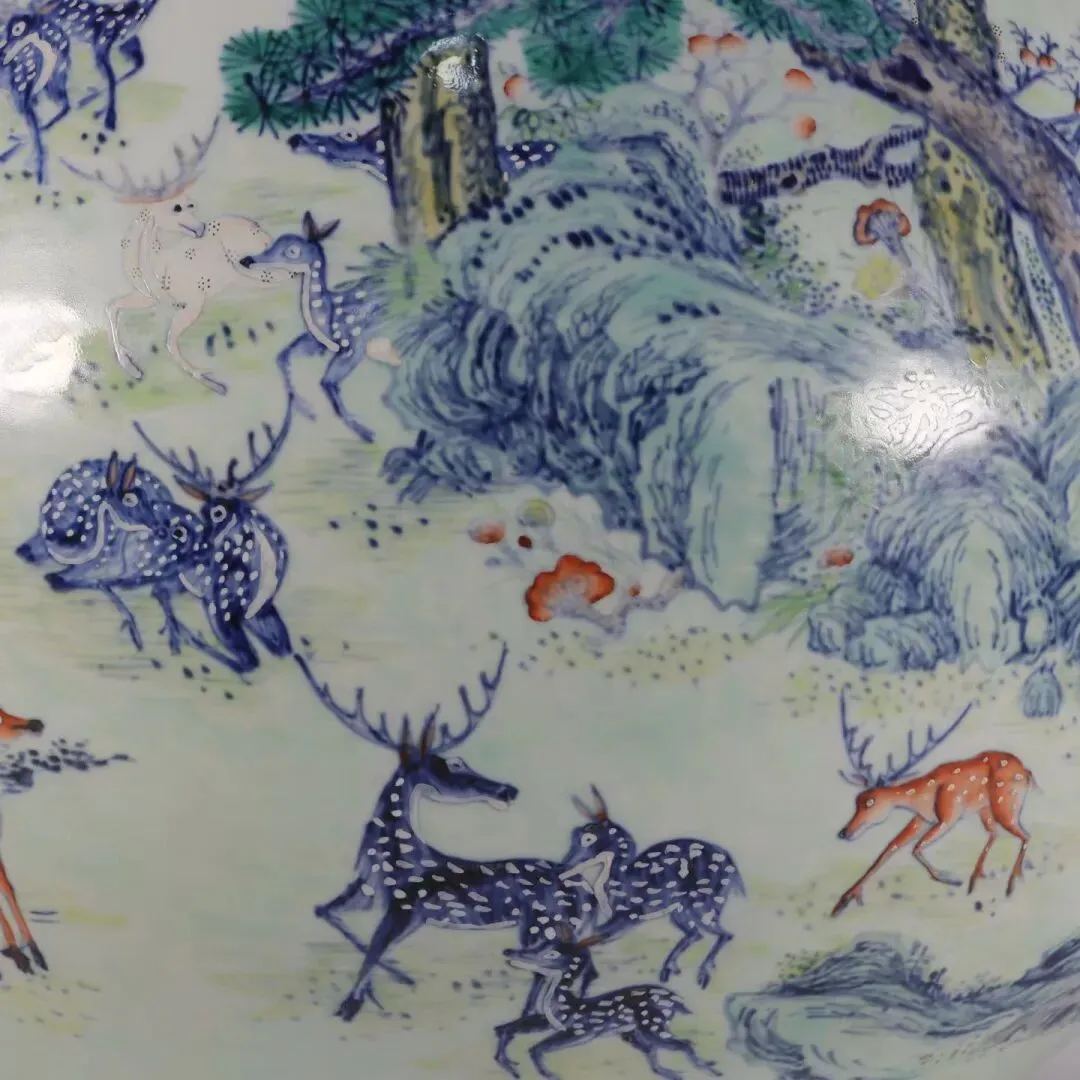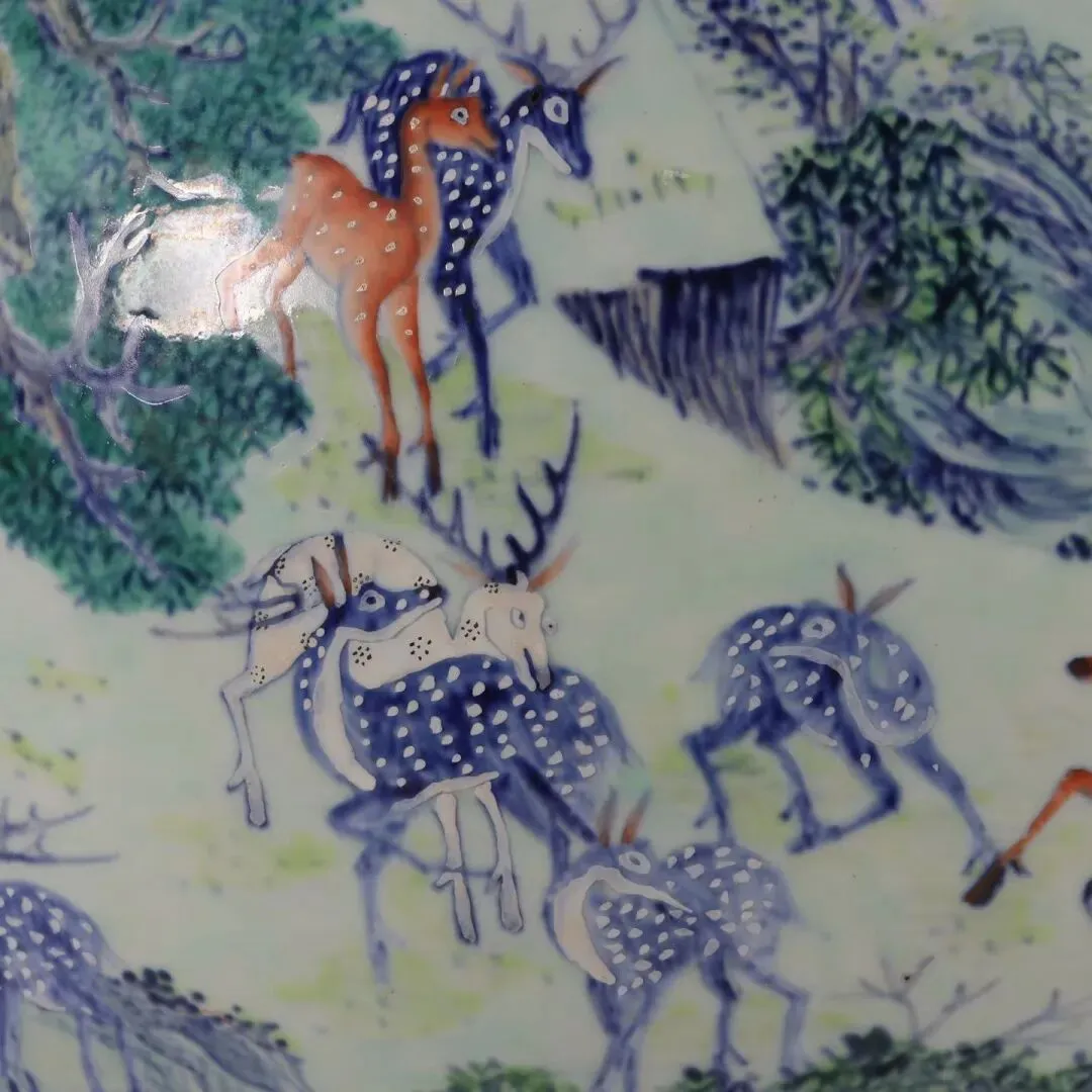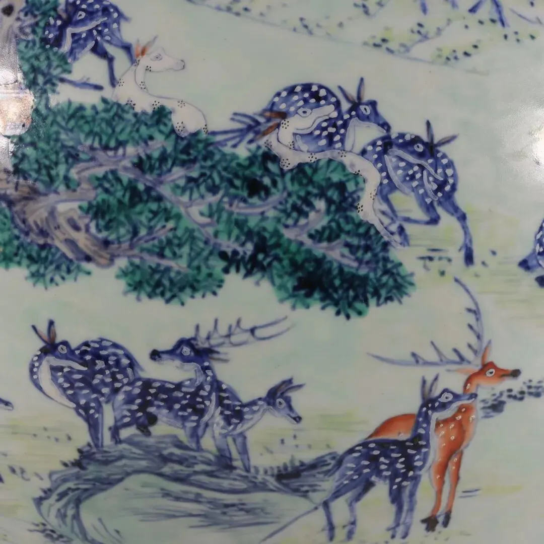 器身的百鹿图是整器的灵魂所在。画师以青花勾勒山石、松枝的轮廓,再以斗彩填染色彩,将山林四季的层次铺陈得淋漓尽致。苍松以浓绿、浅绿层层晕染,松针细密如织,仿佛能感受到山风穿过松林的簌簌声;坡石以青花皴擦,间杂赭色苔点,尽显苍古厚重。百只灵鹿或奔跑嬉戏,或卧息林间,或昂首听风,姿态各异、栩栩如生。它们的毛色以青花、矾红、赭黄等色彩交织,有的通体青蓝、斑点如星,有的身披赤褐、斑纹似霞,每一只鹿的神态都被刻画得细腻入微,连鹿角的纹理、皮毛的质感都清晰可见。